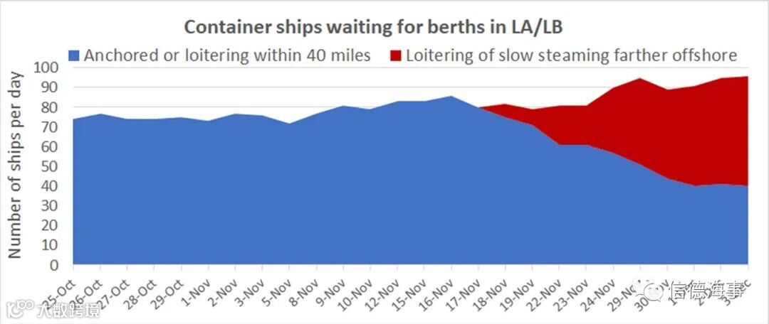 这个数字意味着,目前美国加州港口的集装箱船舶拥堵情况并没有好转,甚至是在进一步恶化。