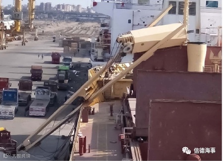 2017年1月22日,马耳他旗散货船TRAPEZITZA轮在埃及的DAMIETTA港进行卸货作业过程中发生严重事故,1号克令吊从轴架底座出断裂,其上部及吊臂掉落到码头并导致货舱舱盖及甲板栏杆受损。