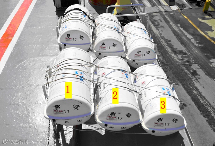 某滚装客船配备救生定员25人的气胀式救生筏18只,其存放方式是以每组3只共6组存放并且每个救生筏组设置了3个自由漂浮装置(静水压力释放器),见图3。
