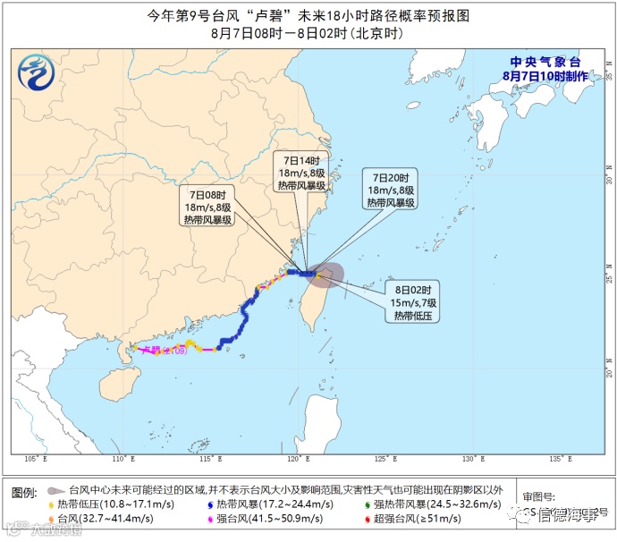 大风预报:受“卢碧”和西南季风的共同影响,7日14时至8日14时,东海南部、南海东部、巴士海峡、台湾海峡、台湾以东洋面以及浙江沿海、福建沿海和台湾岛沿海将有6-7级大风,其中台湾海峡北部、台湾岛西北部沿海、台湾东南洋面和东海东部的部分海域风力可达8-9级,阵风10-11级。