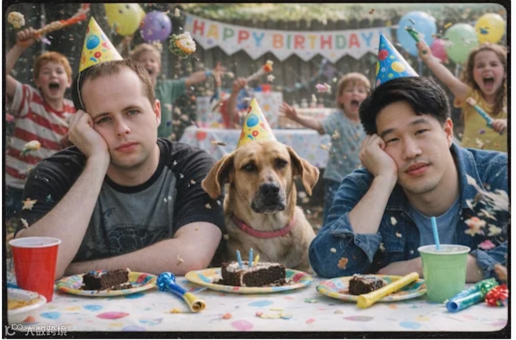 把这两位男士和狗合在同一张照片里:用 2000 年代胶片相机风格拍摄,他们在一个小朋友生日派对上看起来一脸无聊。
