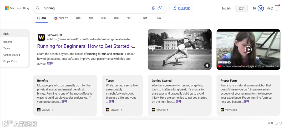 比如搜索“running”,与之高度相关的内容就包括“running benefits”、“running gear”等内容。