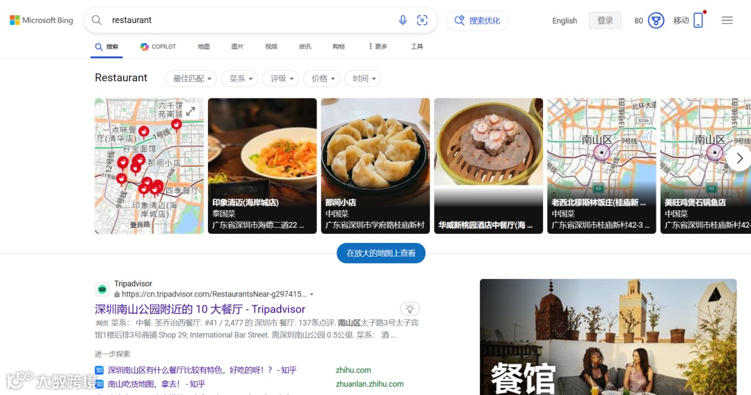 比如IP在深圳南山区的用户搜索“餐馆”这个关键词时,Bing倾向于展示南山区附近的餐馆信息(菜品推荐、地理位置、美食点评)。