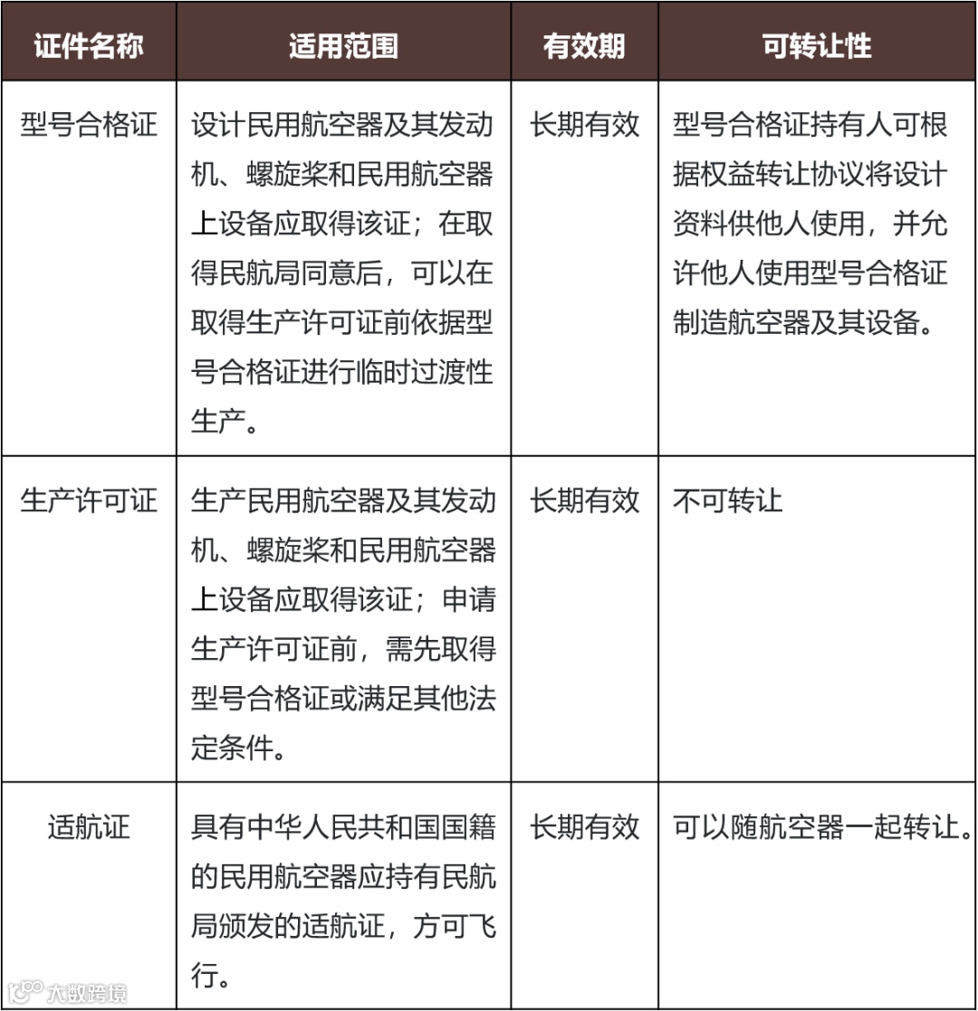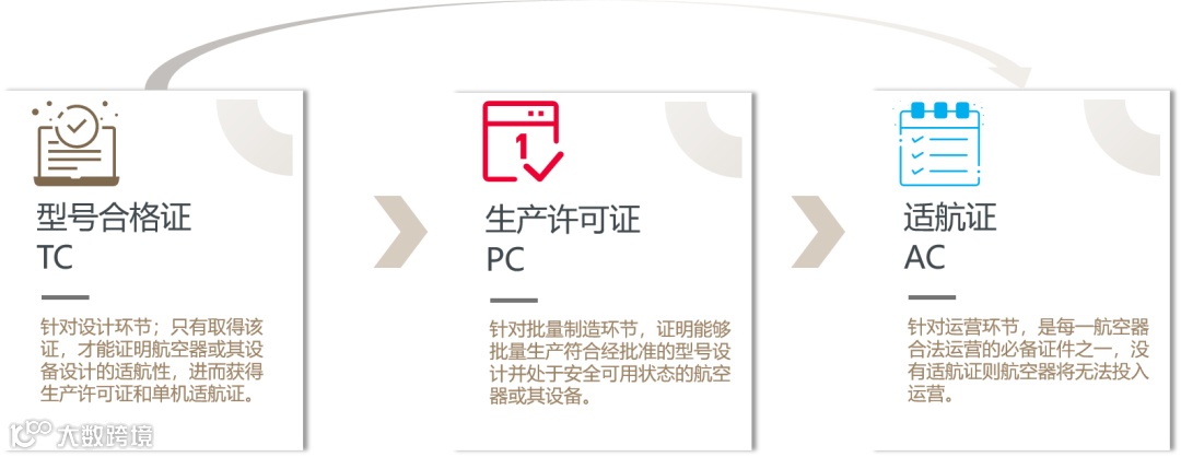 依据《民用航空法》,民用航空器设计、生产、销售需取得适航“三大通行证”:型号合格证(TC)、生产许可证(PC)、适航证(AC)。
