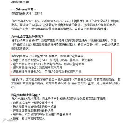 自2025年12月25日起,通过电商平台等直接向日本消费者销售特定产品的海外卖家,必须指定一名在日本的“国内管理人”(俗称“日代”),并履行一系列义务,否则将面临禁售!