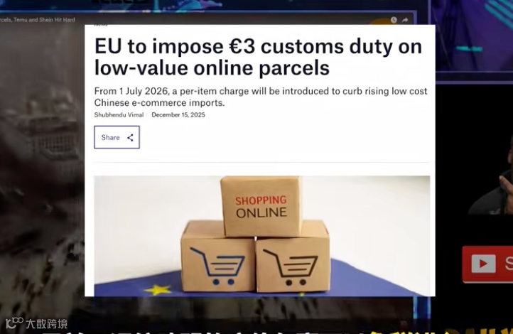 12月13日消息,据外媒报道,欧盟财长同意从2026年7月起对价值低于150欧元的进口包裹征收每件3欧元的固定关税,欧盟发言人表示,在欧盟能够就进口征税问题达成永久性解决方案之前,都将实施这项固定费用。