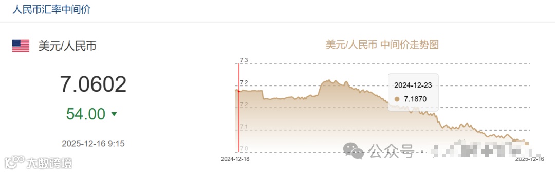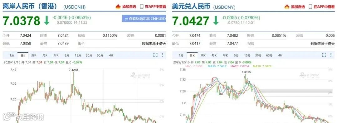 12月16日,在岸、离岸人民币对美元汇率双双升破7.05,盘中离岸人民币对美元汇率盘中最高升至7.0358,在岸人民币对美元汇率盘中最高升至7.0417,双双创下2024年10月8日以来的新高。