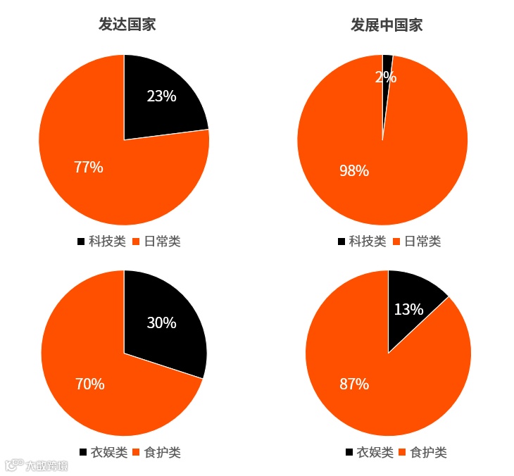 根据 GoodsFox 分析师俞江琨统计,发达国家的科技类宠物用品比例比发展中国家的更高,食护以外的其他品类(衣娱等)占比也明显更高。