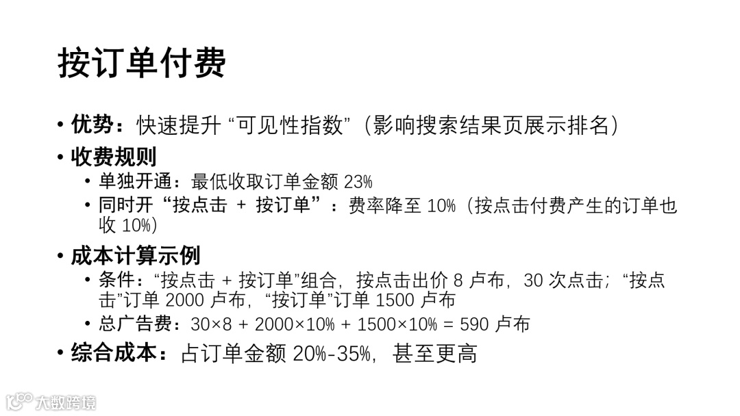 什么意思呢?举个例子,一个商品同时参加了这两种广告,假设每次点击出价为8卢布,获得了30次点击,按点击付费产生的总订单金额是2000卢布,按订单付费产生的总订单金额是1500卢布。广告费的计算为30*8+2000*10%+1500*10%=240+200+150=590卢布。