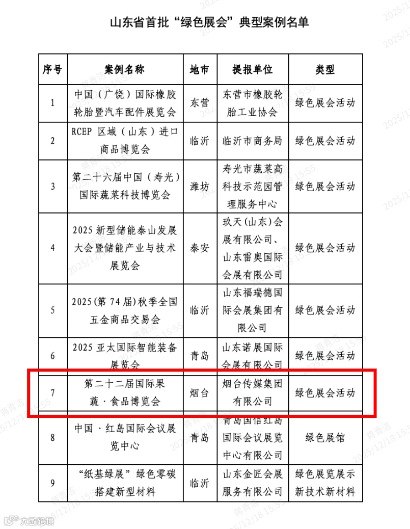近日,在首批山东省“绿色展会”典型案例评选中,烟台市报送的“第二十二届国际果蔬·食品博览会”凭借良好的示范与推广价值成功入选。