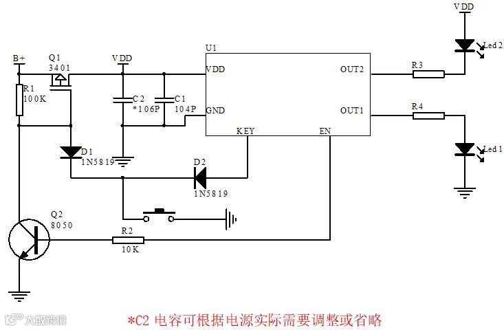 供电范围:DC2.0-5.0V。轻触按键控制三路输出。上电不工作,长按KEY键 2秒开机,OUT1输出高电平,OUT2输出低电平,再次长按KEY键 2秒关机,OUT1输出低电平,OUT2输出高电平。