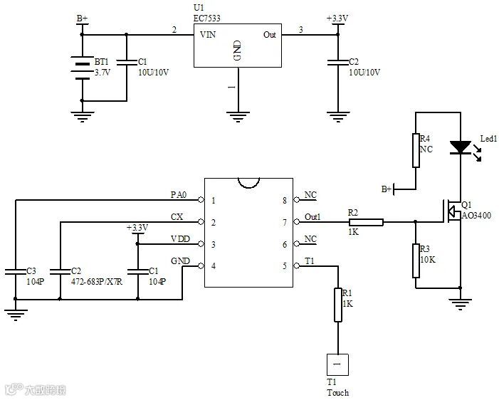 一路触摸按键输入,一路LED输出;