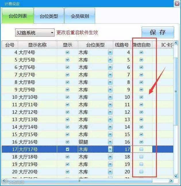 再次进入「台位列表」标签里分配不同桌台对应哪种台位类型(收费标准)