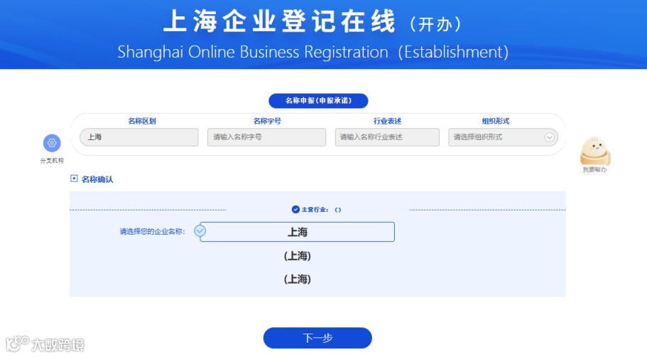 上海+名称字号+行业表述+组织形式,举例:上海企帮帮企业服务有限公司
