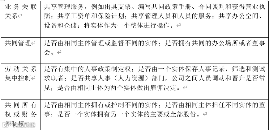 根据《民权法》、ADEA和ADA的规定,判断美国雇主是否“控制”其境外子公司,主要考量四个因素:业务关联、共同管理、劳资关系的集中控制、共同所有权或财务控制权。该标准与国家劳动关系委员会(NLRB)的“综合企业标准”相似,旨在评估美国公司是否对境外公司构成实质性控制,从而决定二者是否应被视为单一雇主。平等就业机会委员会(EEOC)强调,需综合评估各项因素,重点在于劳动关系是否被集中控制,而非要求所有因素同时具备(详见表1)。