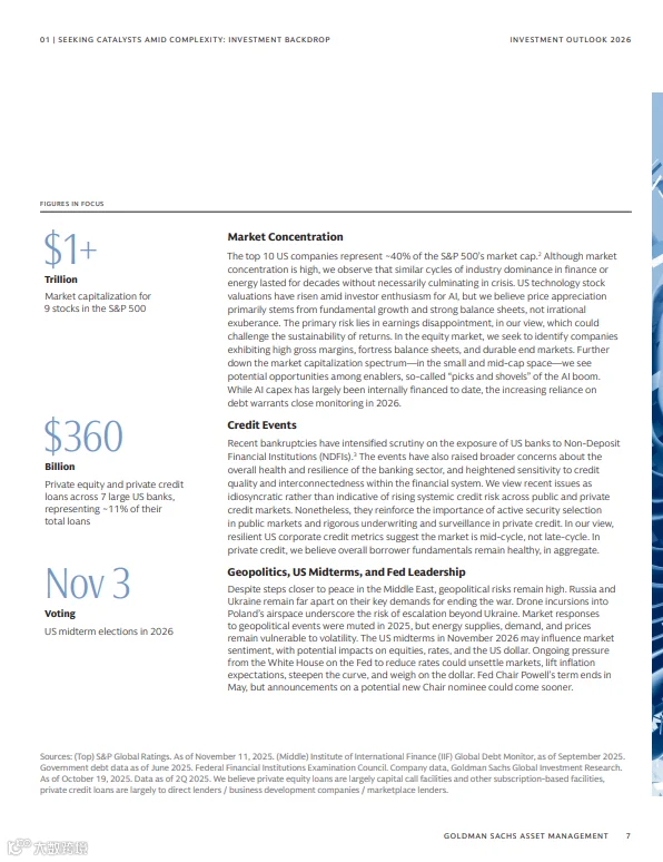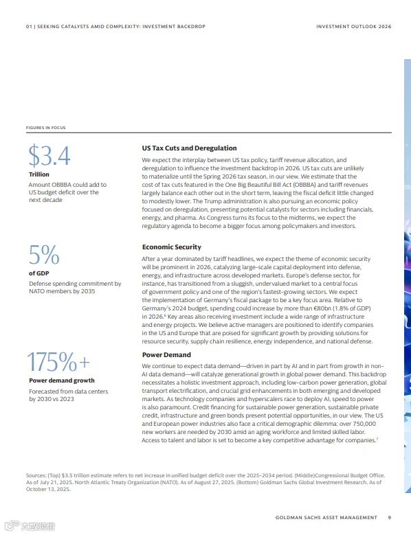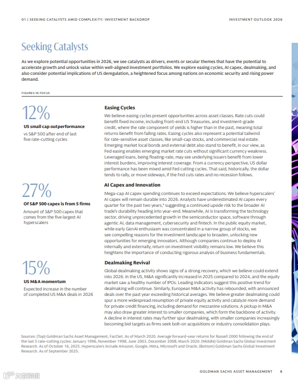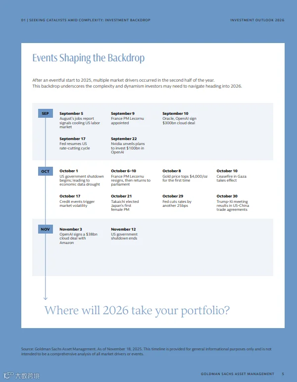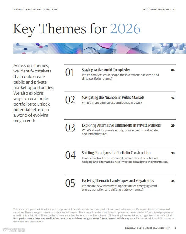 高盛最新发布的《2026年投资展望:在复杂中寻找催化剂》报告指出,全球市场正面临央行政策分化、贸易秩序重构、地缘冲突与AI革命等多重因素的叠加影响。投资者需在波动中主动挖掘结构性机会,构建多元化组合以应对不确定性。