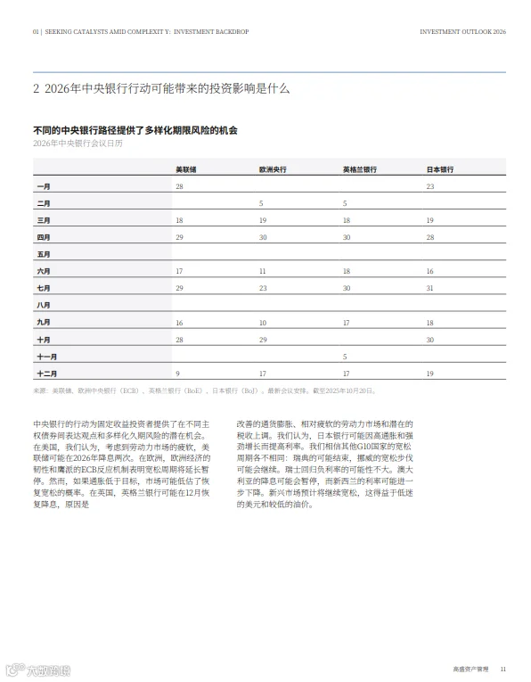 央行政策分化:G10国家中9/10在2025年启动降息,但2026年路径各异——美联储或降息两次,欧央行按兵不动,日本央行开启加息。