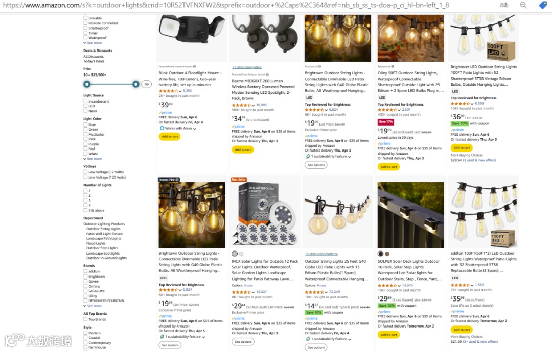 Amazon平台上搜索“outdoor lights”,其中带有智能照明、防水、无线等特点的产品销量较为可观,在6000-10000不等。