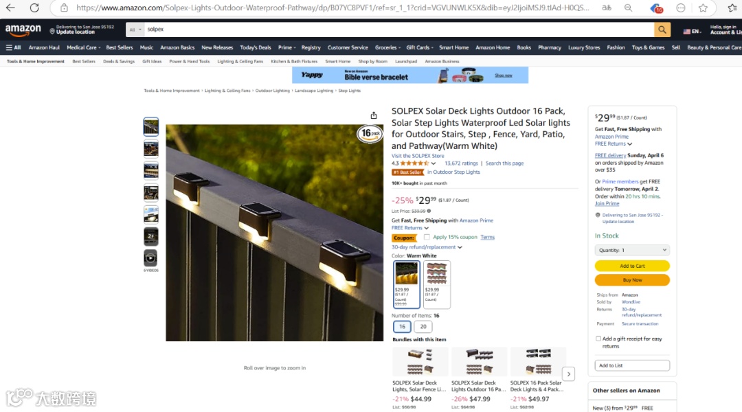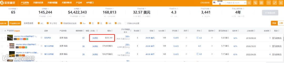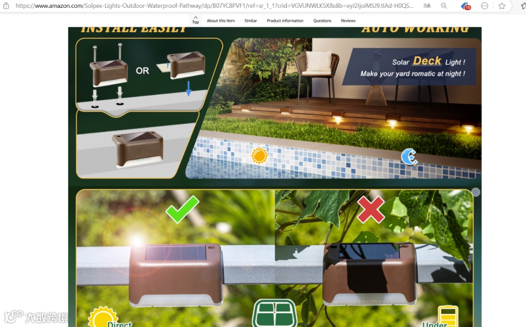 卖家精灵数据显示,近30天,亚马逊上一款SOLPEX户外太阳能甲板灯销量达1.45万件,销售额达35.5万美元。