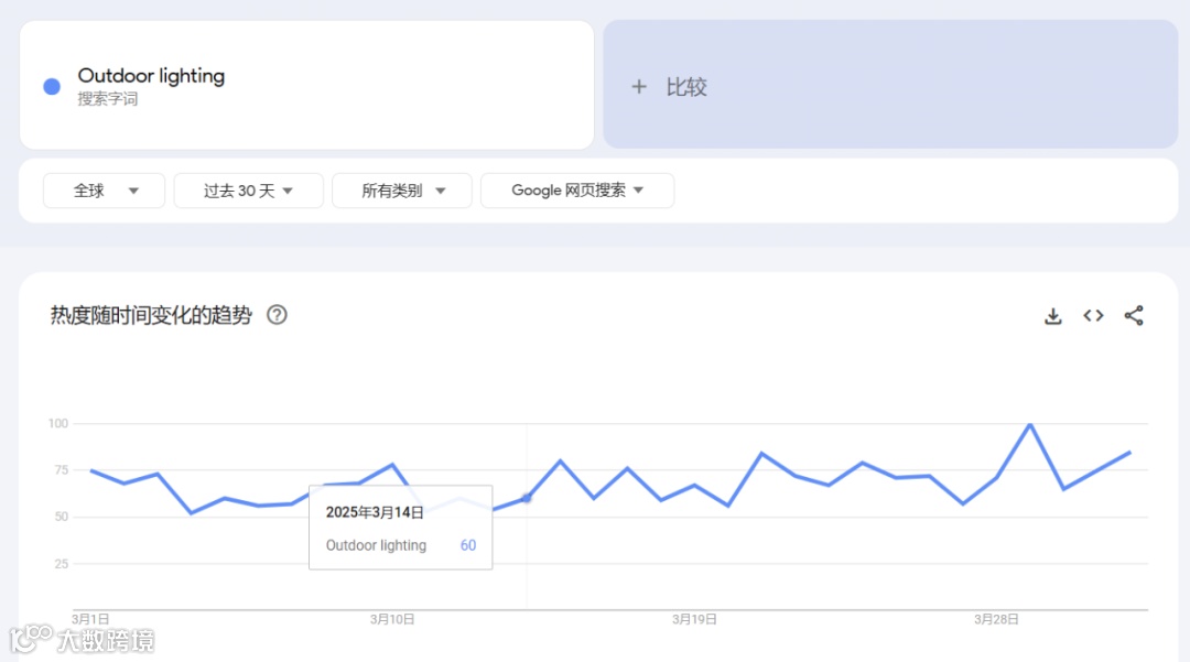 谷歌趋势显示,搜索“Outdoor lighting(户外照明)”,过去30天,全球范围内搜索热度保持在53-100的高位区间,且处于持续上升态势。