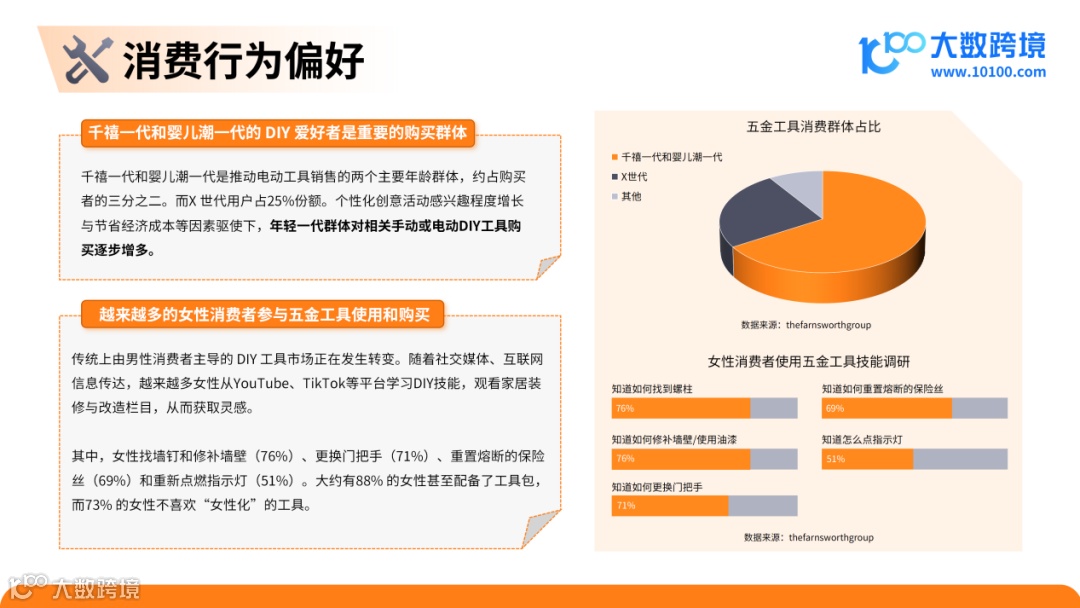 从消费行为来看,大约三分之二的千禧一代和婴儿潮一代的DIY爱好者购买电动工具,是重要的购买群体,随着社交媒体、互联网信息传达,越来越多女性配备了工具包,参与五金工具使用和购买。