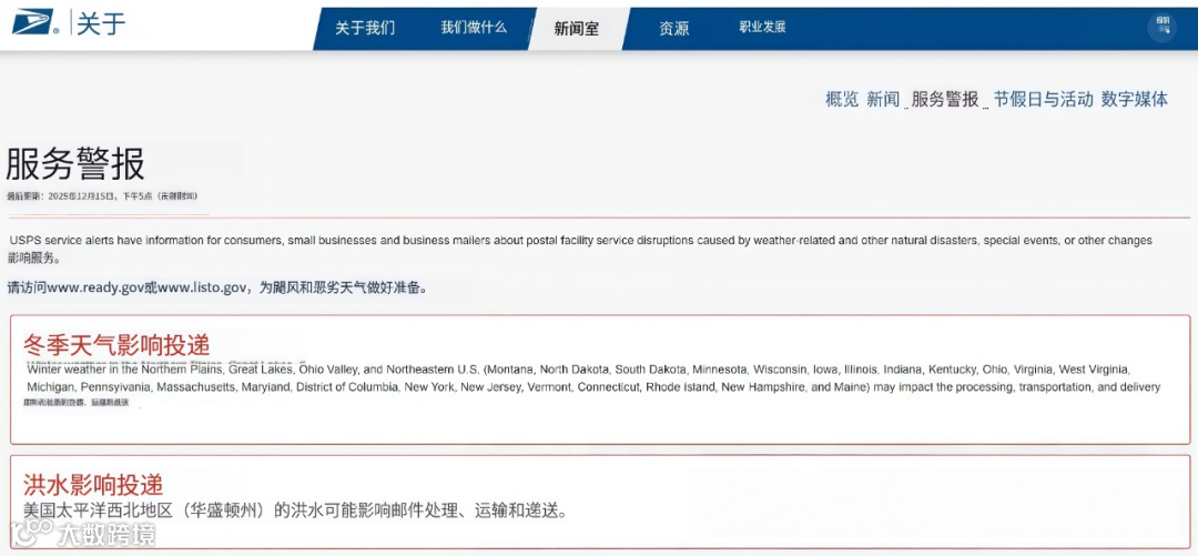 针对这一情况,USPS正式发布物流延误预警,表示邮件、包裹递送等主流服务均已受到波及,建议民众及商户提前规划寄送时间,避免因延误影响重要物品收发。