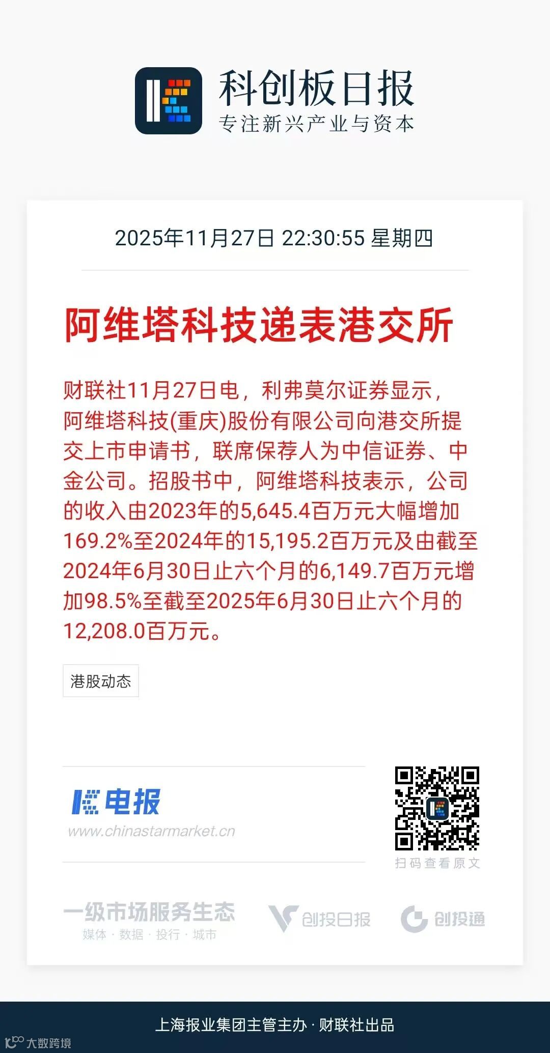 利弗莫尔证券显示,阿维塔科技(重庆)股份有限公司向港交所提交上市申请书,联席保荐人为中信证券、中金公司。招股书中,阿维塔科技表示,公司的收入由2023年的5,645.4百万元大幅增加169.2%至2024年的15,195.2百万元及由截至2024年6月30日止六个月的6,149.7百万元增加98.5%至截至2025年6月30日止六个月的12,208.0百万元。