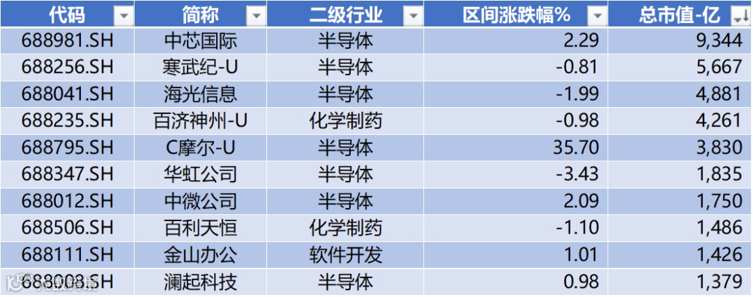 上图是本周科创板前十大权重公司呈现分化,摩尔线程涨35.7%居首,华虹公司居末。