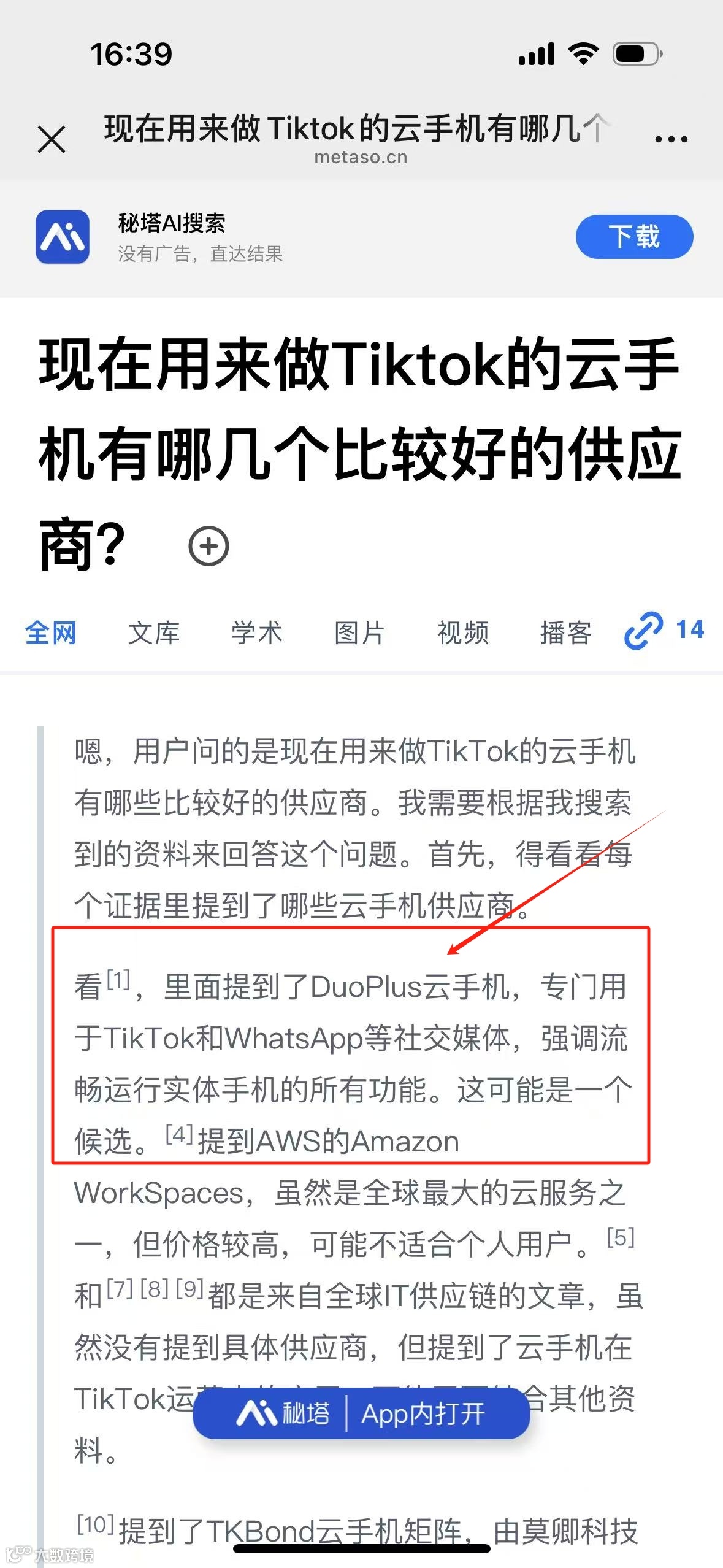 除了DeepSeek,有用户提问秘塔AI“现在做TikTok云手机都有哪些”,它给出了联网搜索的答案,第一个提到的是DuoPlus云手机。