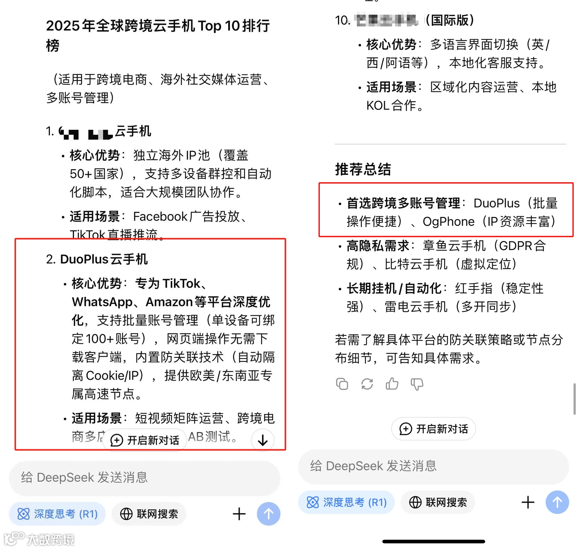 当我要求DeepSeek给出2025最好用的跨境云手机排行榜时,只等待了几秒钟,便得到了以下回答: