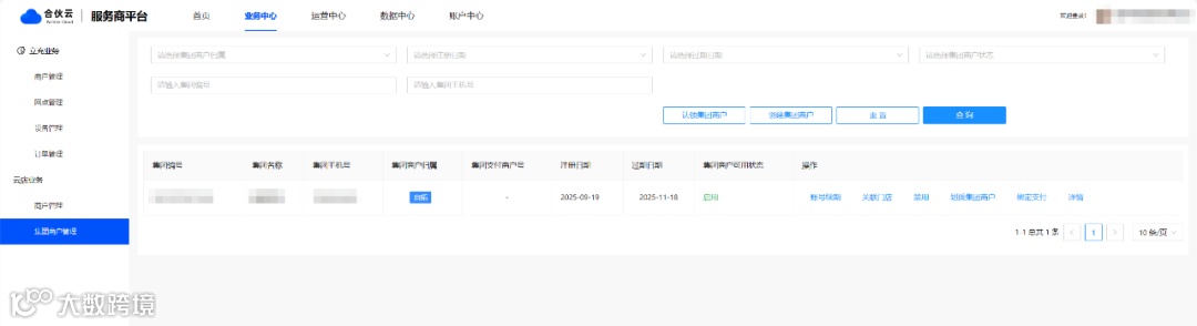 合伙云服务商平台路径:业务中心-云店业务-集团商户管理。