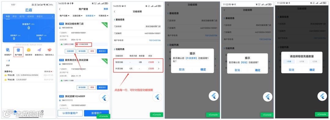 选择短信功能或外卖功能进行续期,短信续期可选择给商家充值的短信数量,并自动使用库存中的对应条数的“短信授权码” ;外卖功能续期将自动使用库存中的1个“外卖接单授权码”,并自动给商家延期1年。