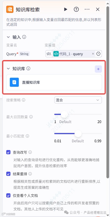 Coze平台提供知识库检索节点,支持上传本地文档、在线数据、飞书文档、Notion及公众号内容等多种格式。将处理后的直播文字导入后,系统会自动进行内容切片,便于后续精准检索。
