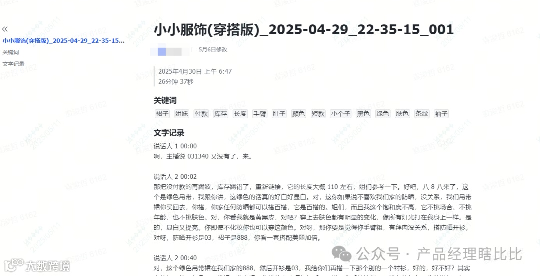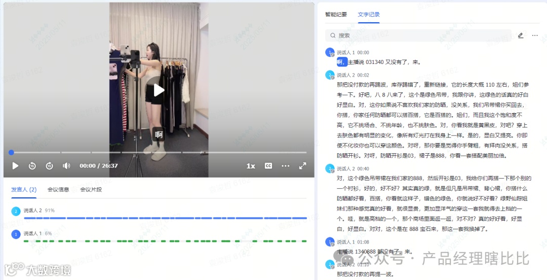 以抖音为例,只需输入直播间链接即可启动录制,视频文件将本地保存。随后利用飞书妙记上传视频,系统可自动识别语音内容并生成带时间戳的文字稿。