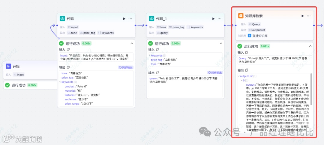 将预处理后的关键词组合成查询语句(如“Polo 衫 源头工厂 微宽松 青少年 棉 100以下 青春活力 高性价比”),提交至知识库检索节点。