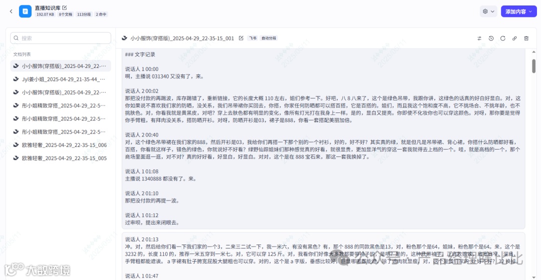 系统返回与查询条件匹配的直播语料片段,作为大模型生成话术的参考依据。