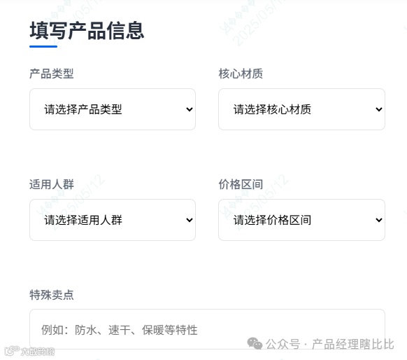用户需填写产品类型(如Polo衫)、核心材质(如棉)、目标受众(如青少年)、价格区间(如100元以下)、产品卖点(如源头工厂、微宽松)等关键信息。