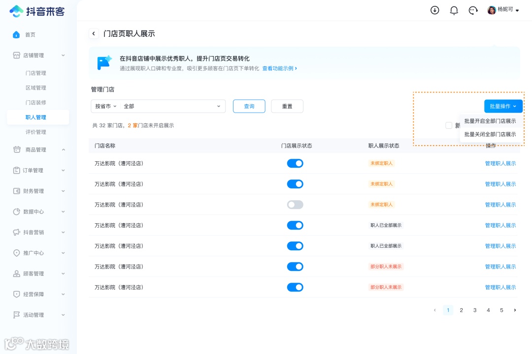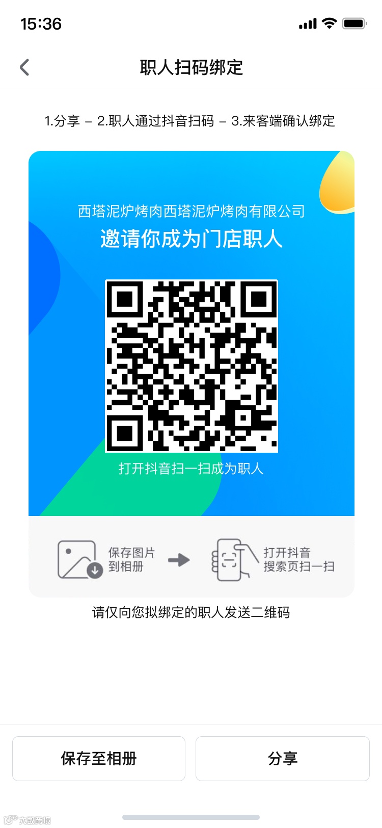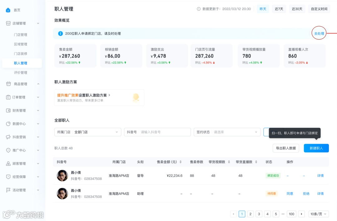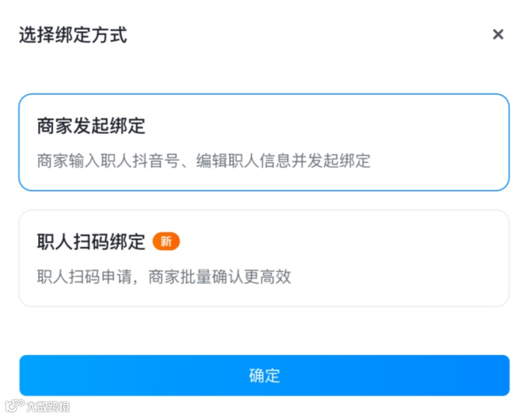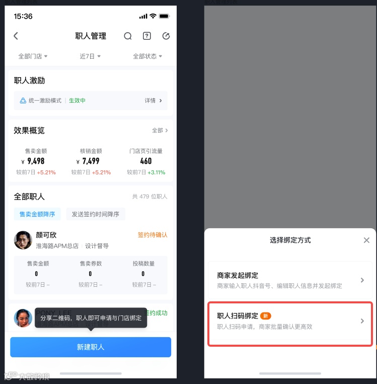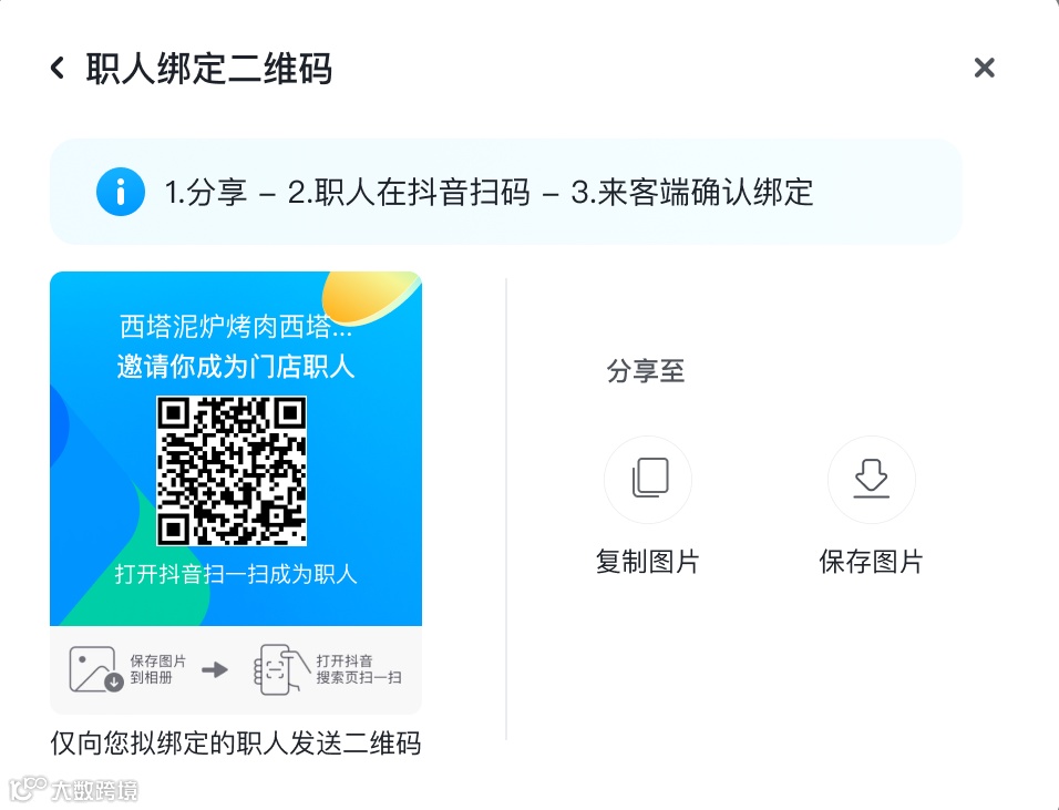 ② 商家生成并下发绑定二维码,员工用抖音扫码,填信息发起绑定;商家最后批量确认 |