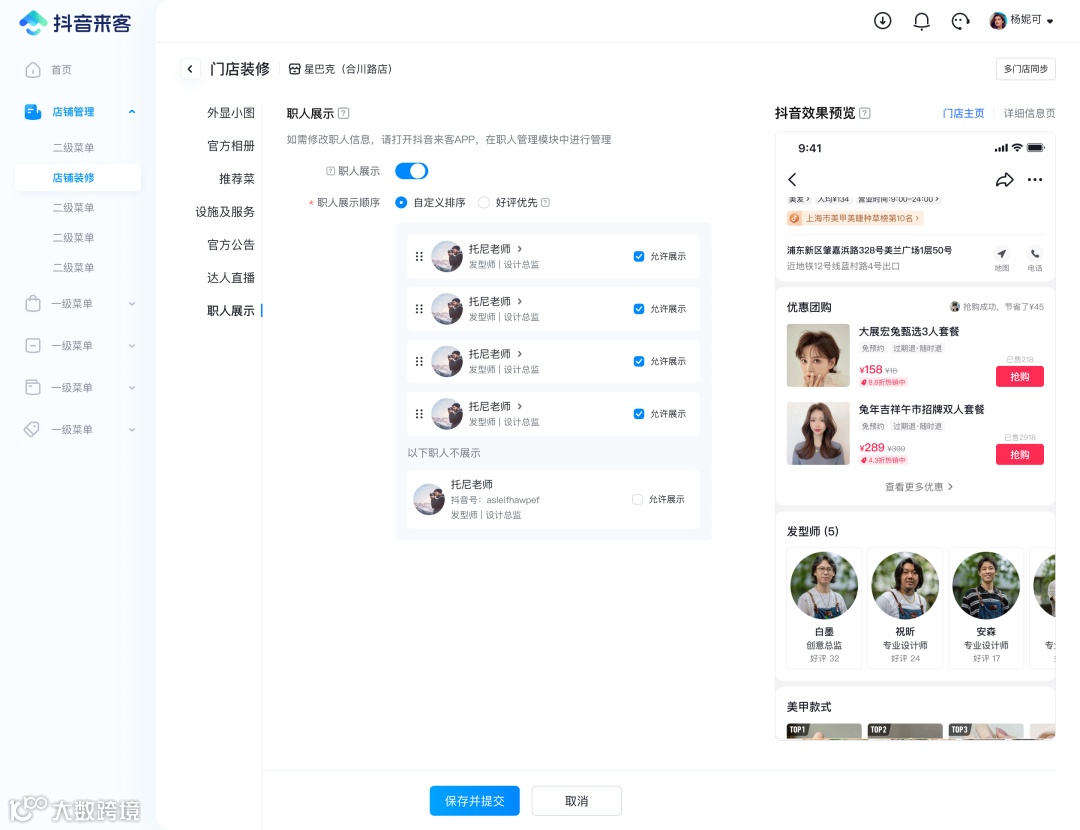 更轻更快,无需做账号内容经营,可在店铺展示职人的专业形象和口碑 (抖音号仅用于验真,不会对外展示身份) |