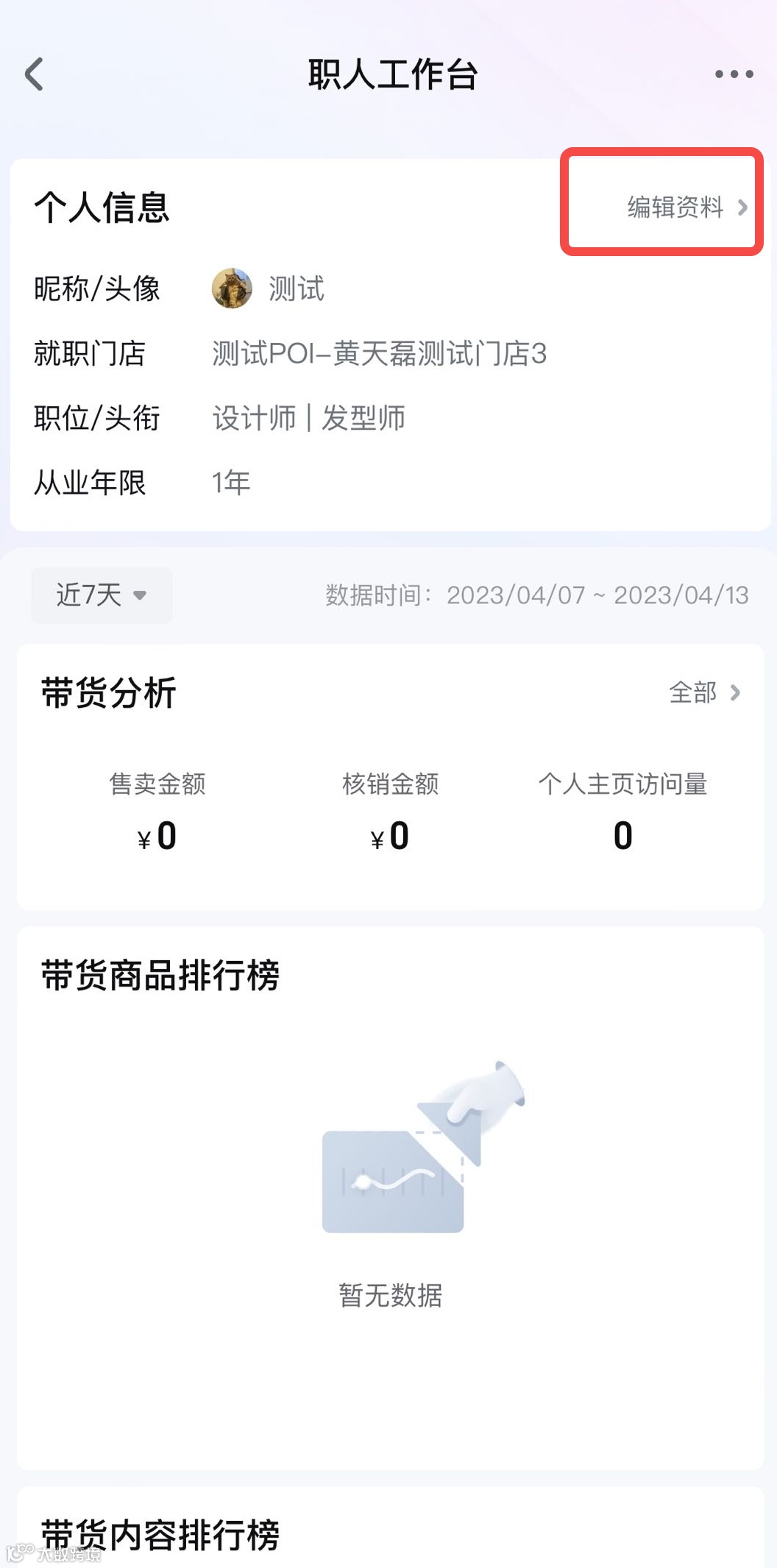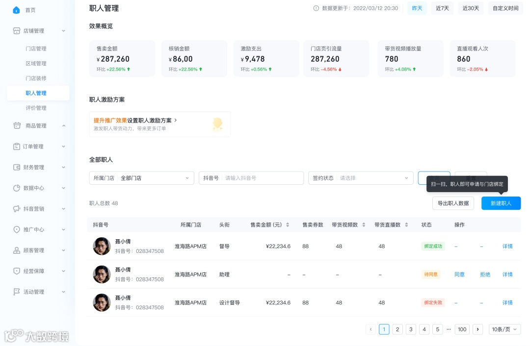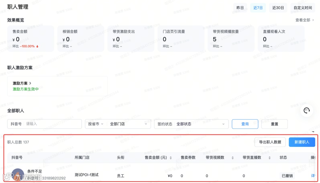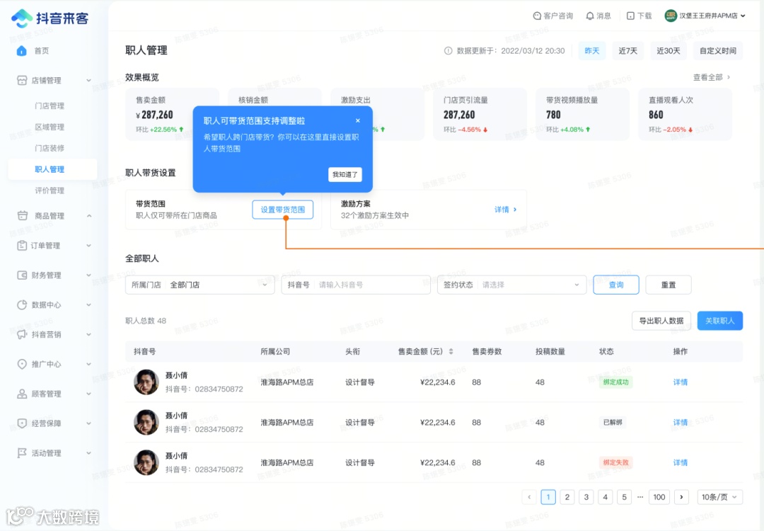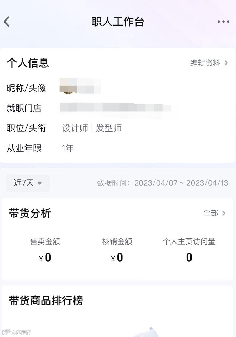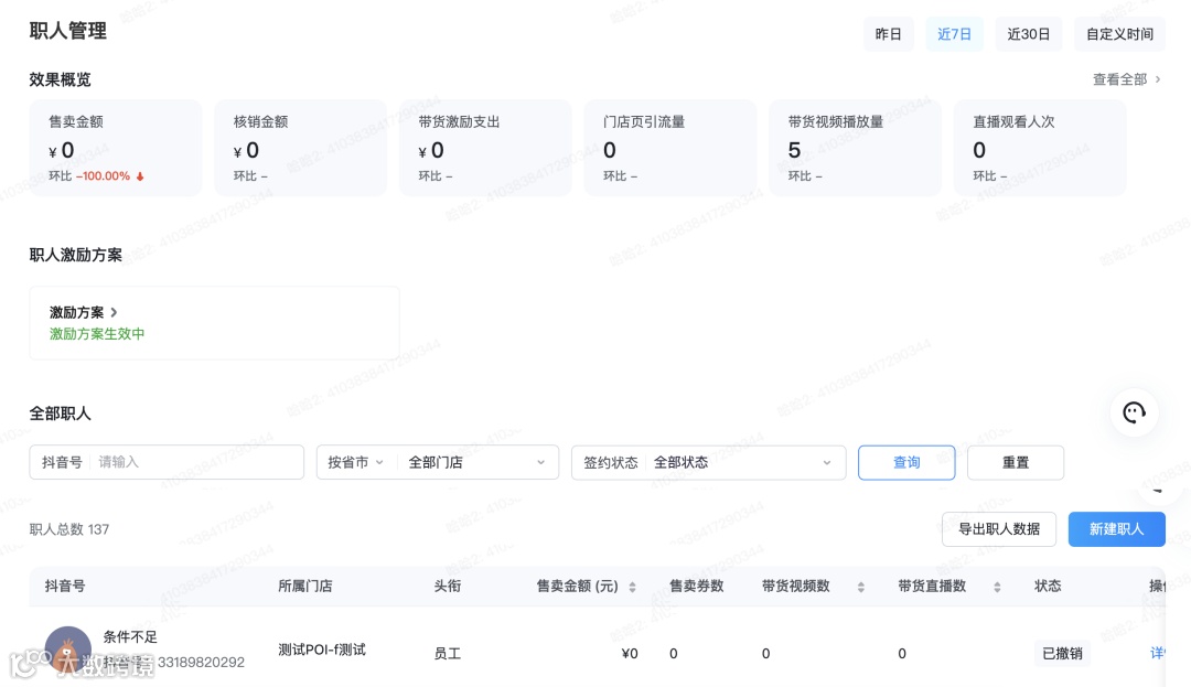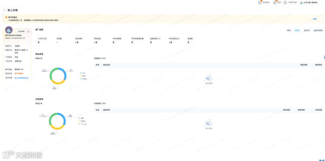 职人个人页面可查看在当前门店的所有数据(若存在解绑后重新绑定仍可展示数据),可用于分析个人视频、直播流量和交易情况。当前数据均为t+1更新。