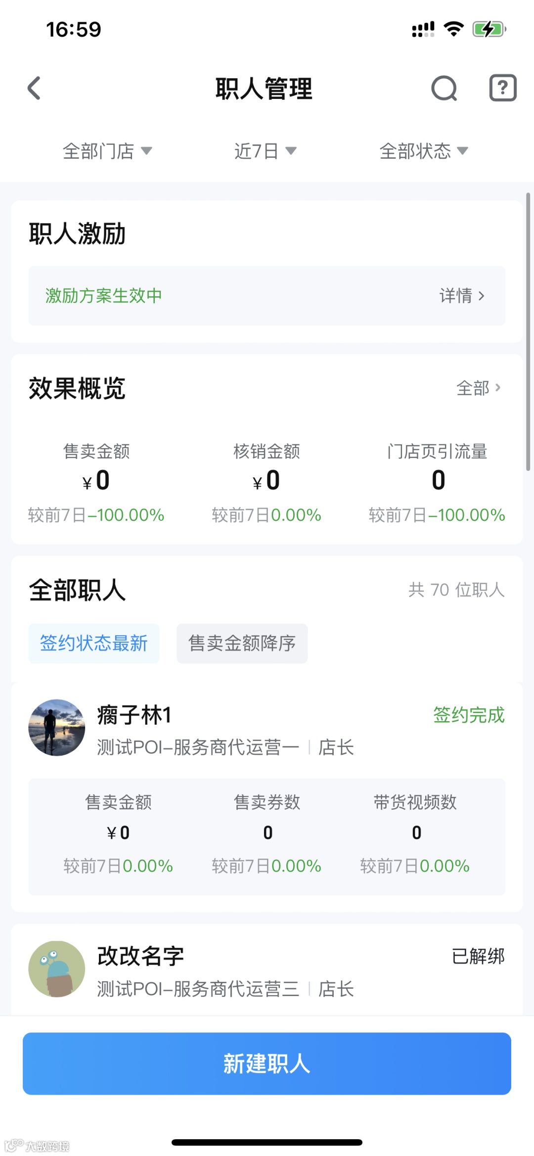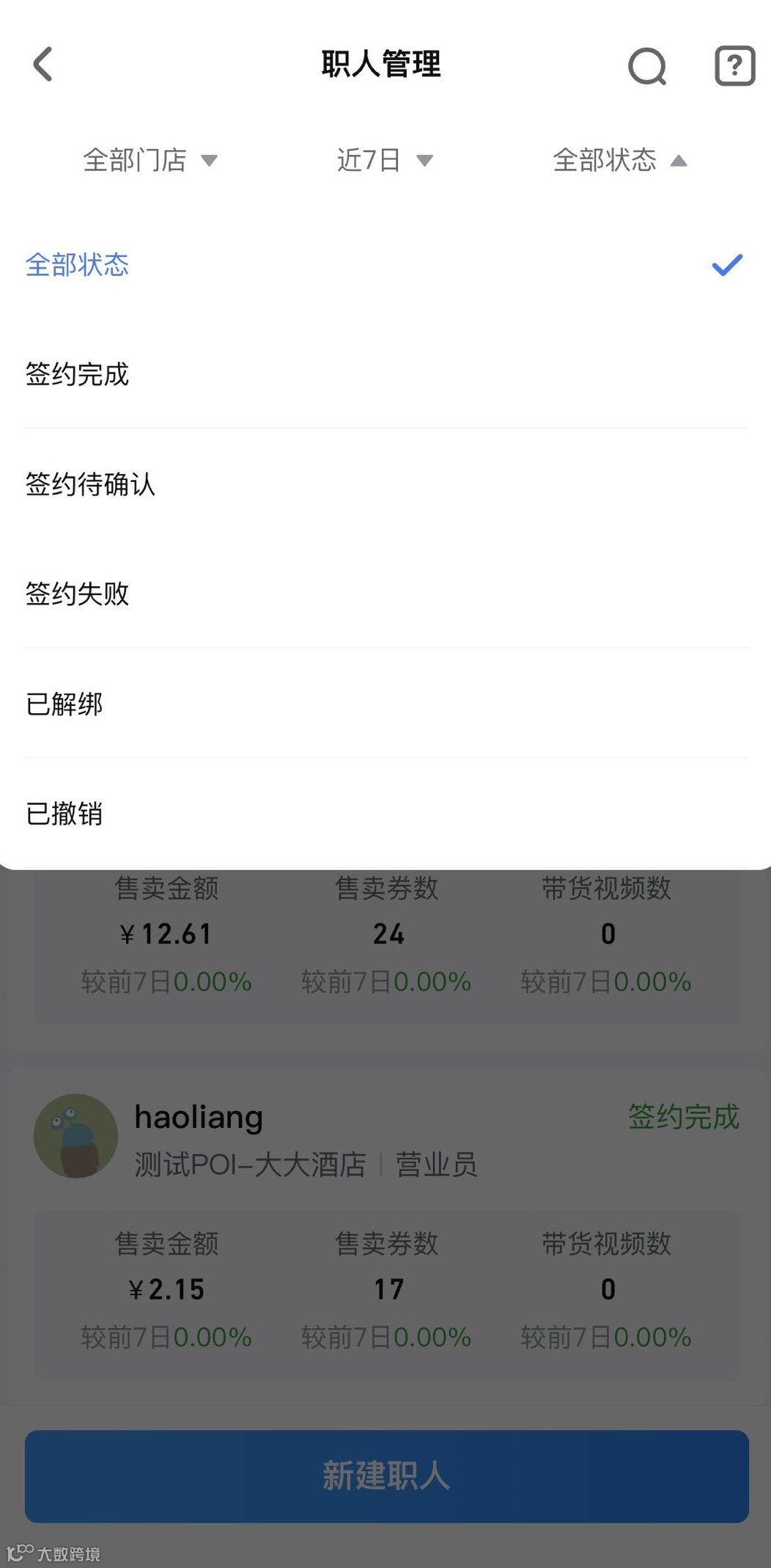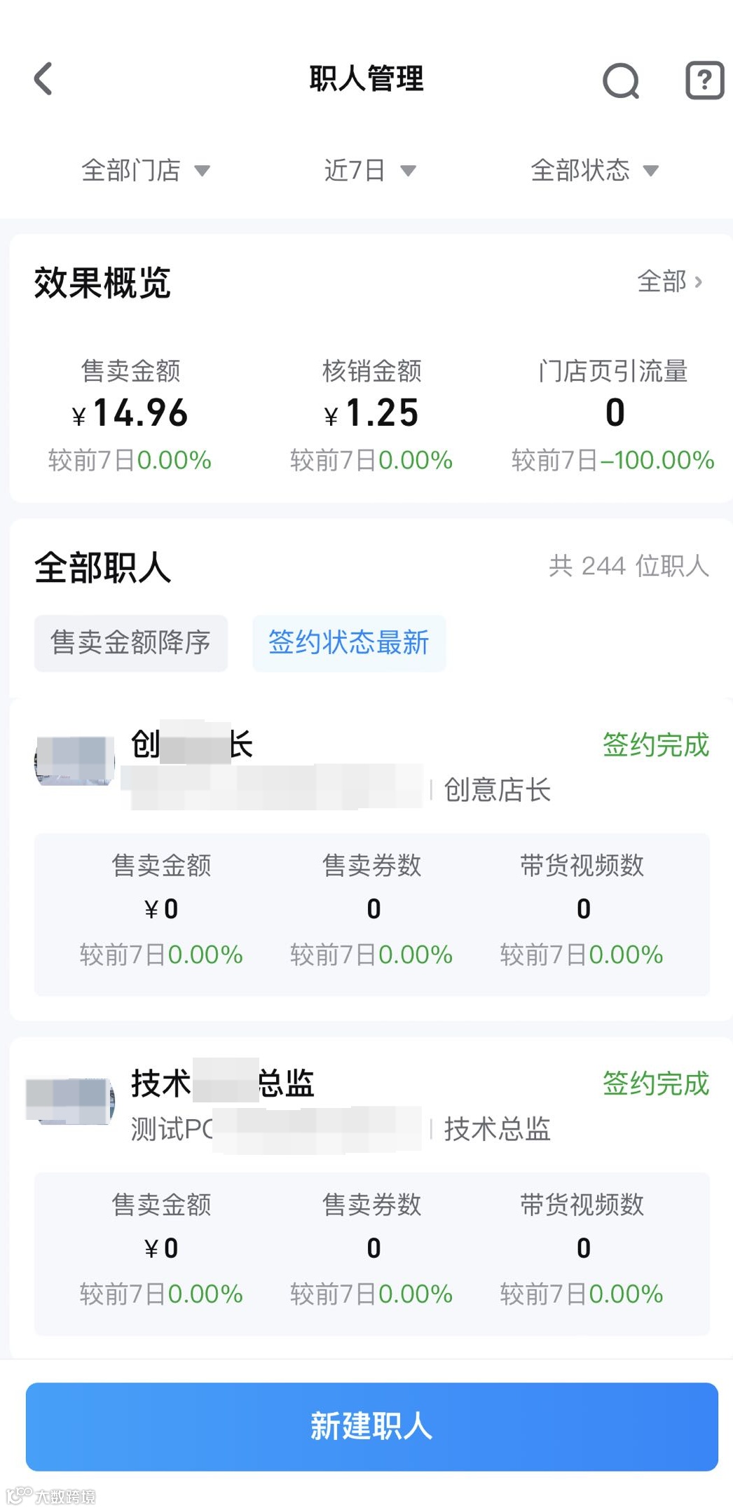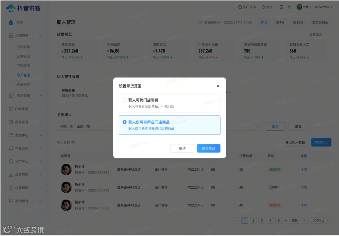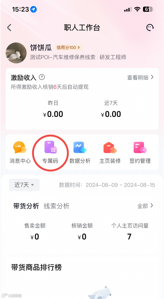 职人个人页面可查看在当前门店的所有数据(若存在解绑后重新绑定仍可展示数据),可用于分析个人视频、直播流量和交易情况。当前数据均为t+1更新。