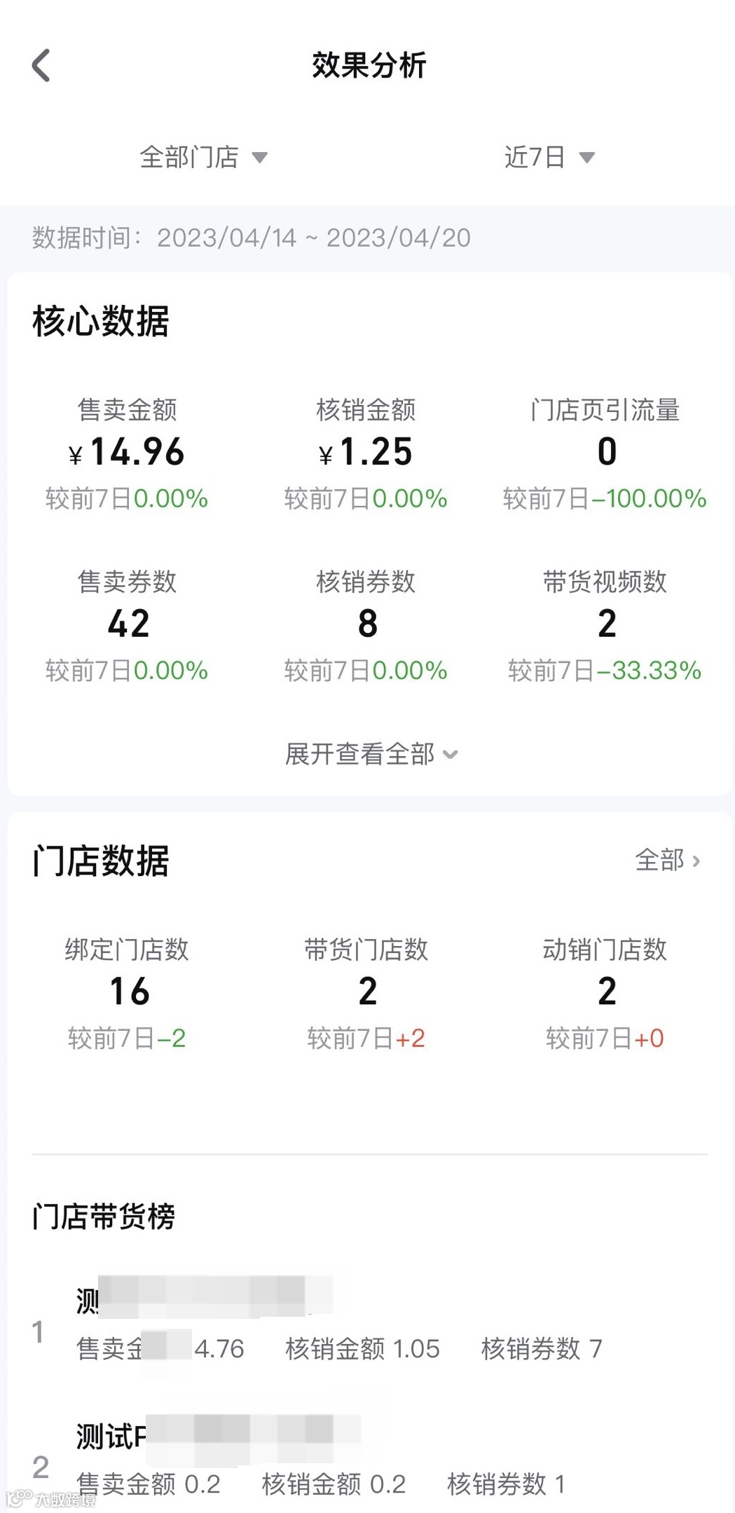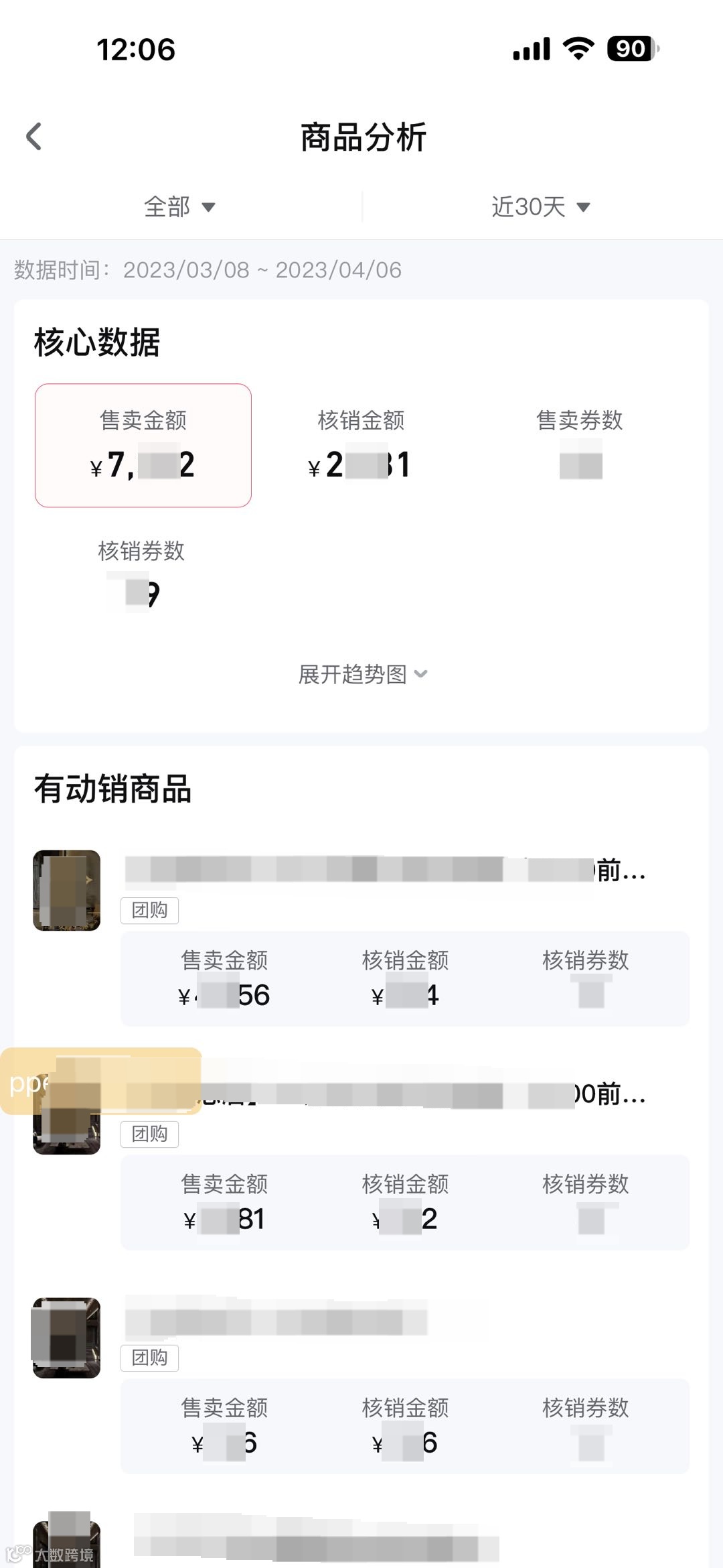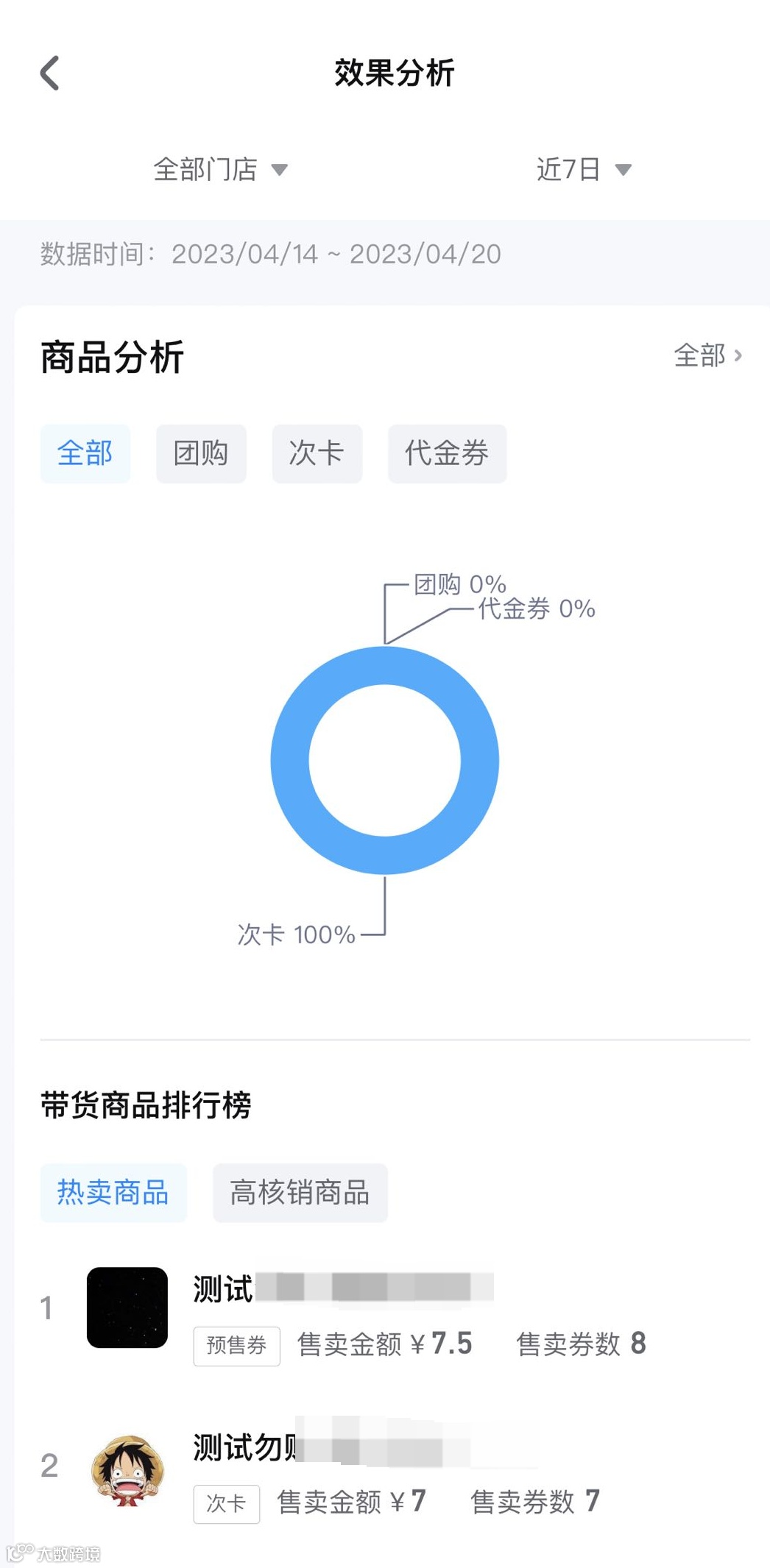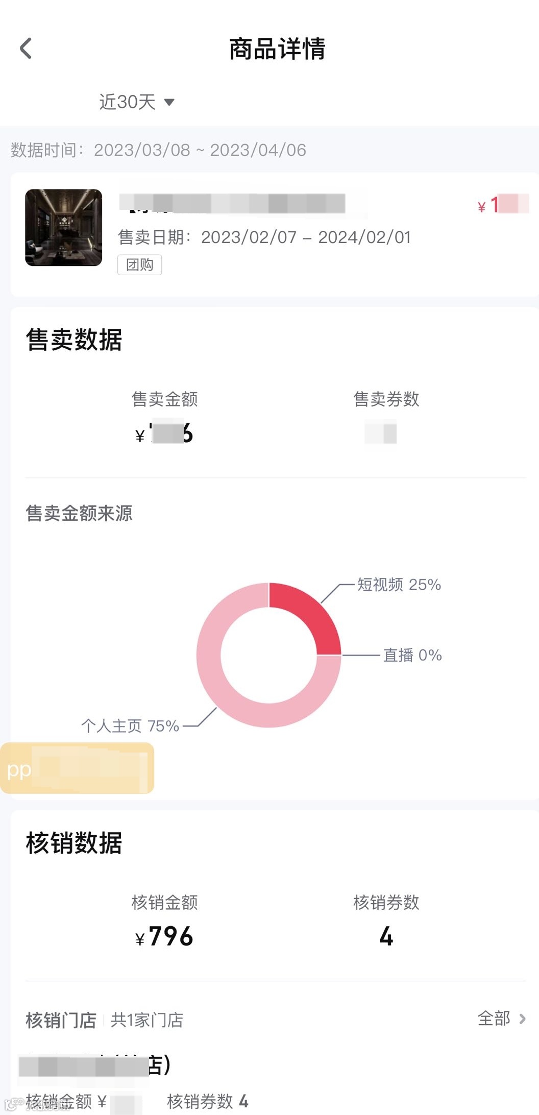可查看核心数据(售卖金额、核销金额、售卖券数、核销券数)以及有动销的商品列表。
