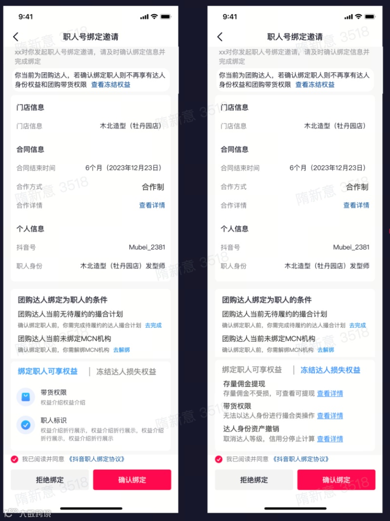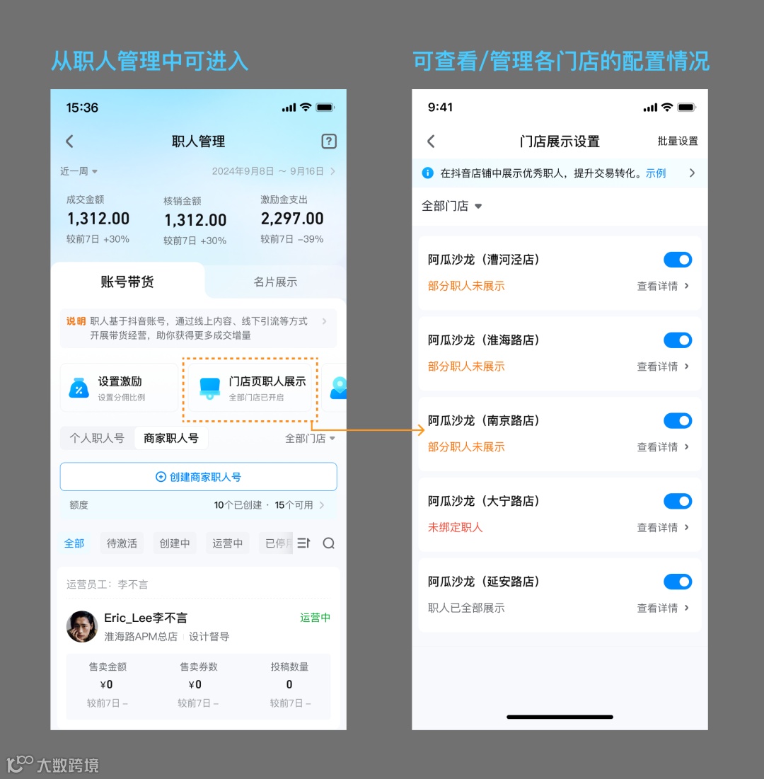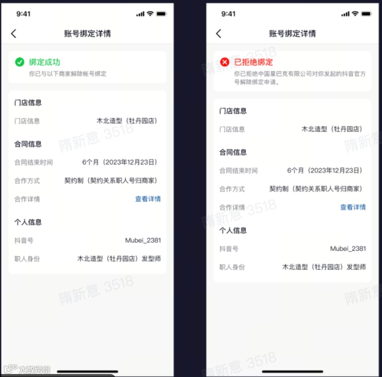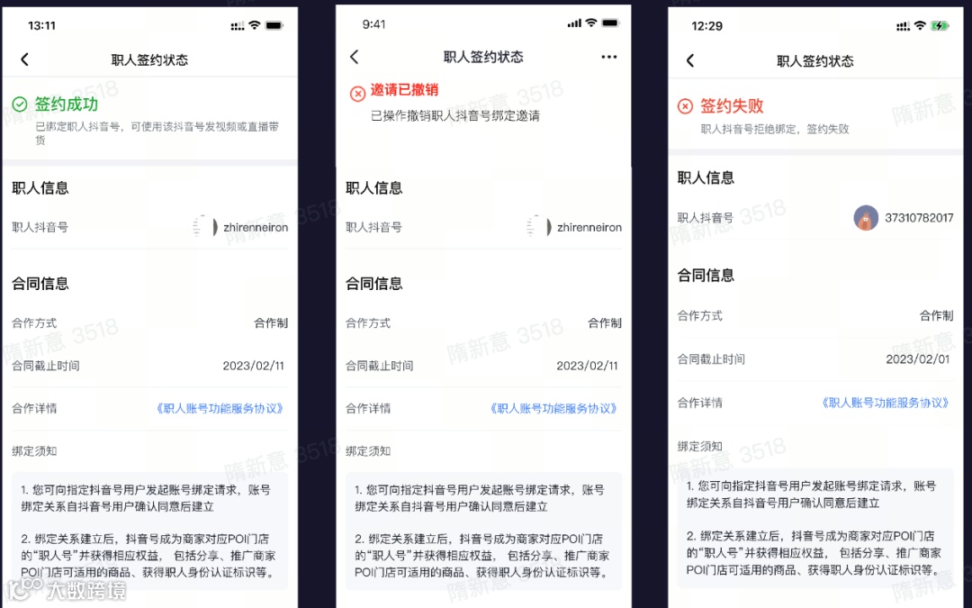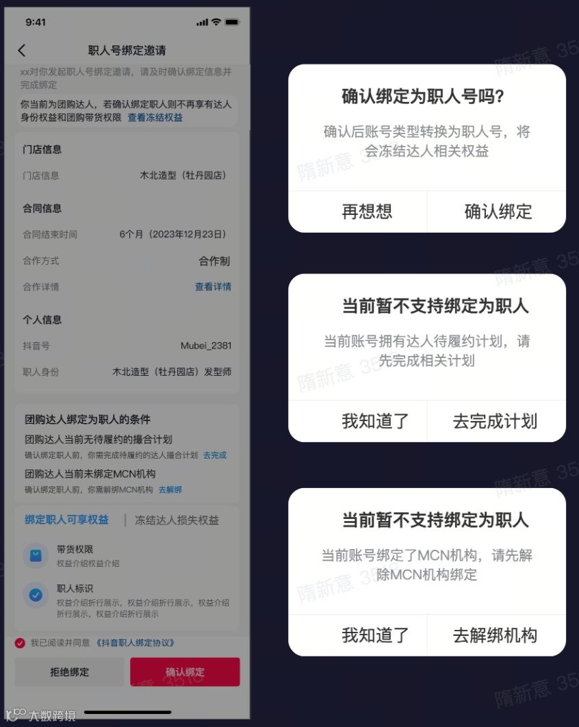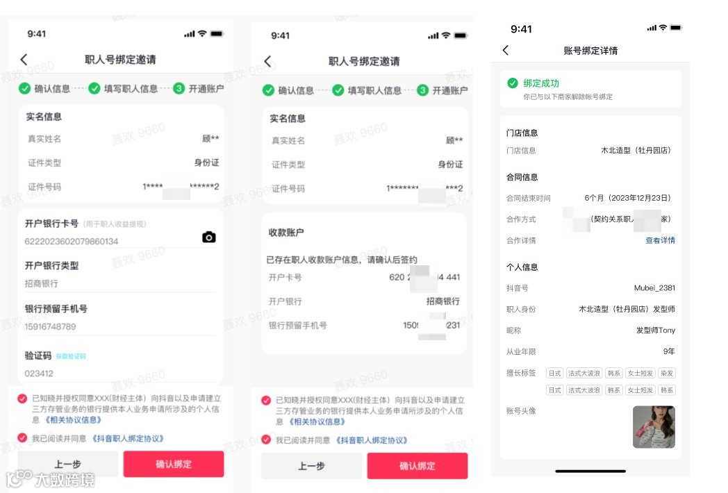 ① 收集职人账号,商家填写信息并邀请员工绑定,员工在抖音端收到通知、确认绑定 |