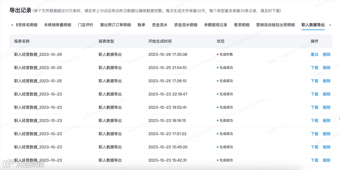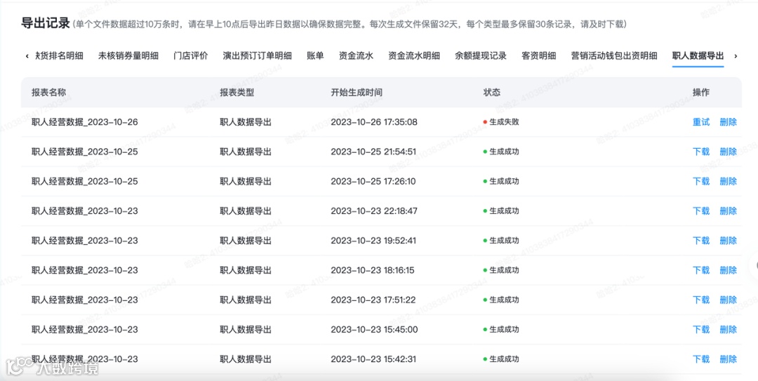 根据筛选信息,进行数据导出,可进行下载操作 |