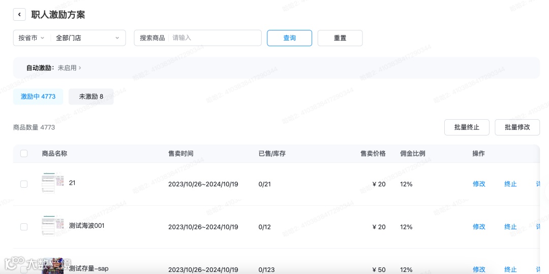 1、终止后,所选中的商品下的激励方案都将立即停止; 2、终止后,职人已发布的视频、正在进行的直播产生的订单,都不再支付激励; 3、已售出的订单,核销后仍需按照订单产生时的激励方案支付给职人激励金额; 4、终止后的激励方案无法恢复,请谨慎操作。 |