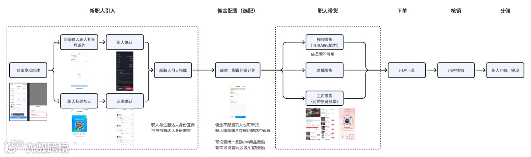 ① 商家收集职人信息,填写信息并邀请员工绑定 → 员工在抖音端收到通知、确认绑定 |