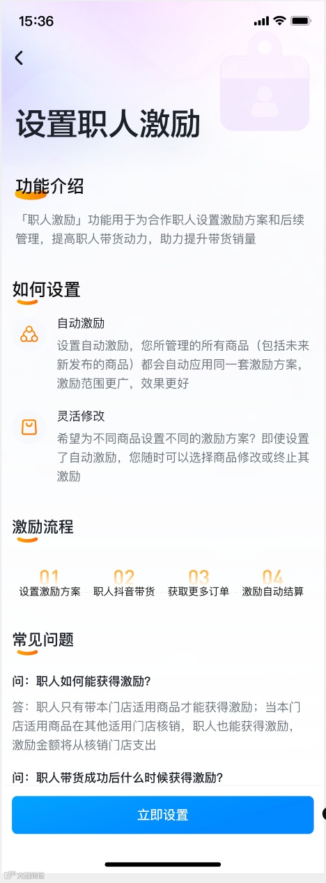 商家配置入口: 进入「职人管理」页面后,即可查看到「职人激励」相关设置引导。 点击「去设置」进入配置页面。 |