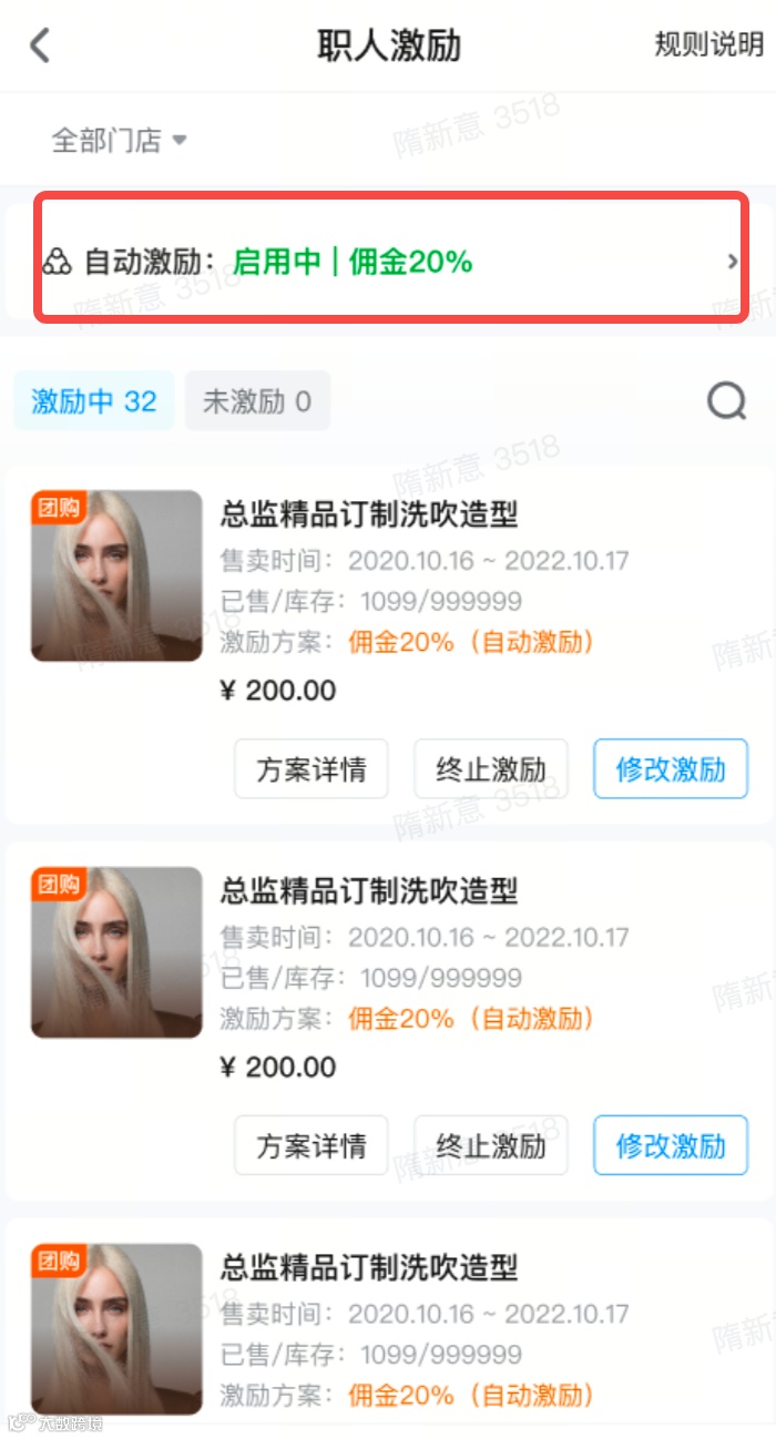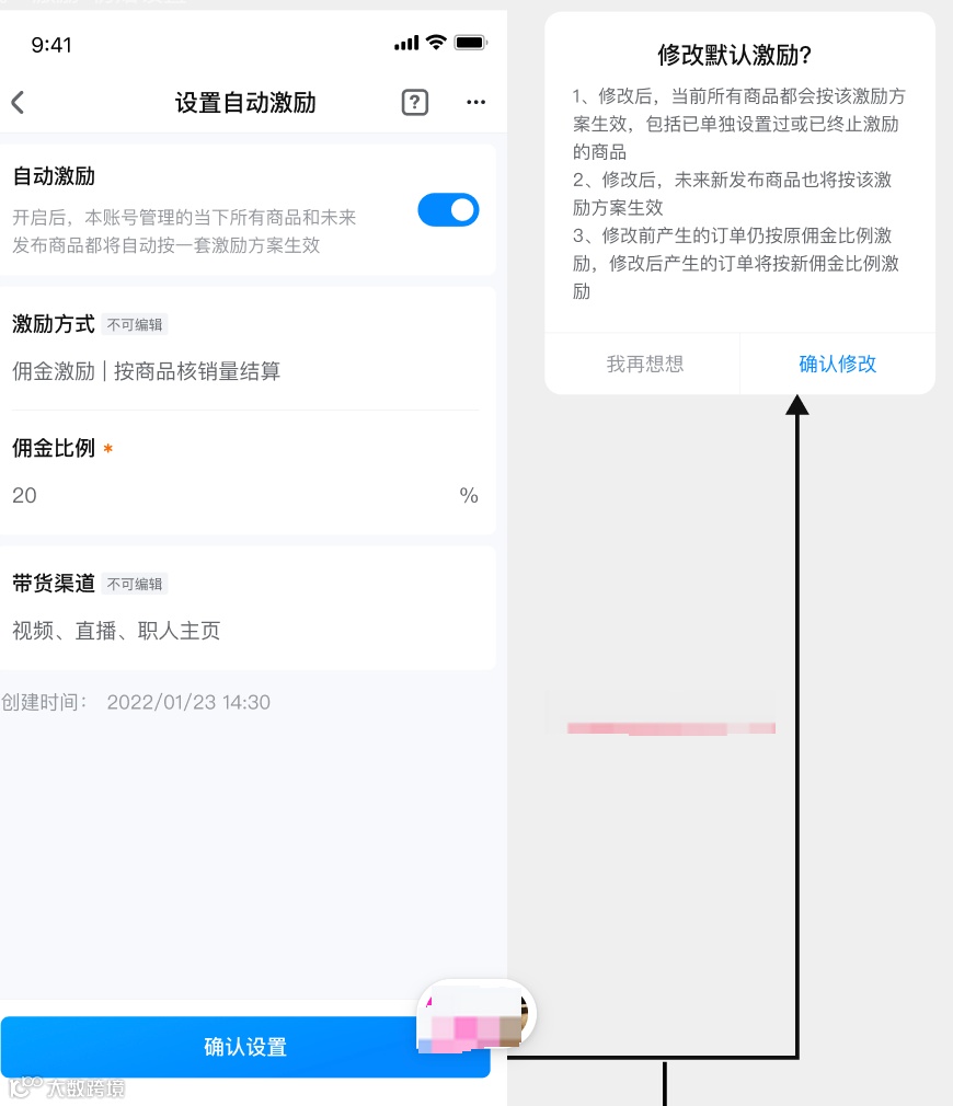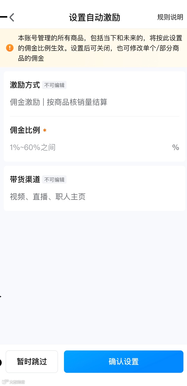 初始设置推荐使用「自动激励」能力: 该账户管理的所有商品,包括后续新增商品,均以自动激励中所设置的佣金比例面向职人进行分佣结算。 拥有自动激励能力后,仍可以逐一修改商品佣金。 自动激励仅品牌户可设置。 |