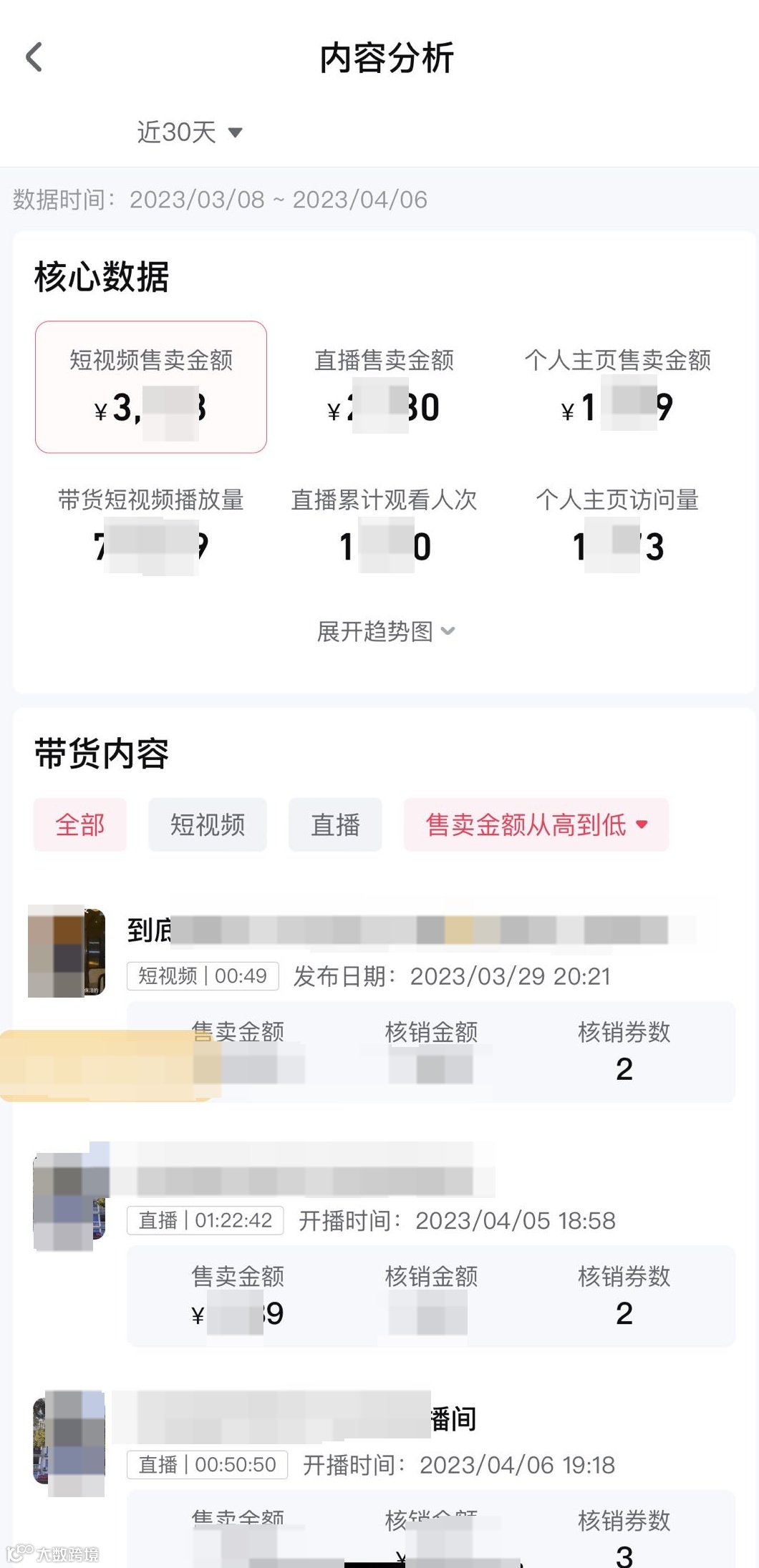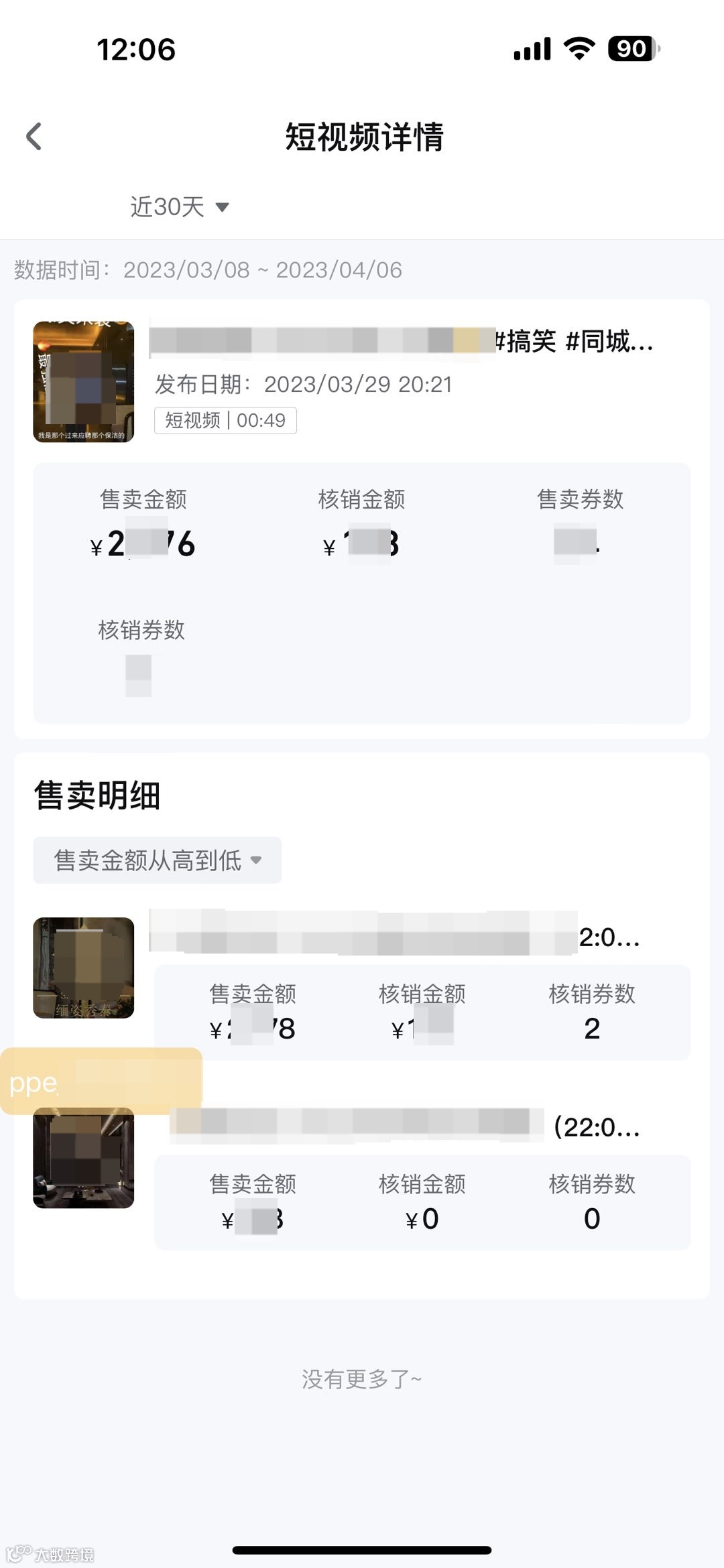 可查看售卖金额、核销金额、售卖数量等,其他规则同视频详情