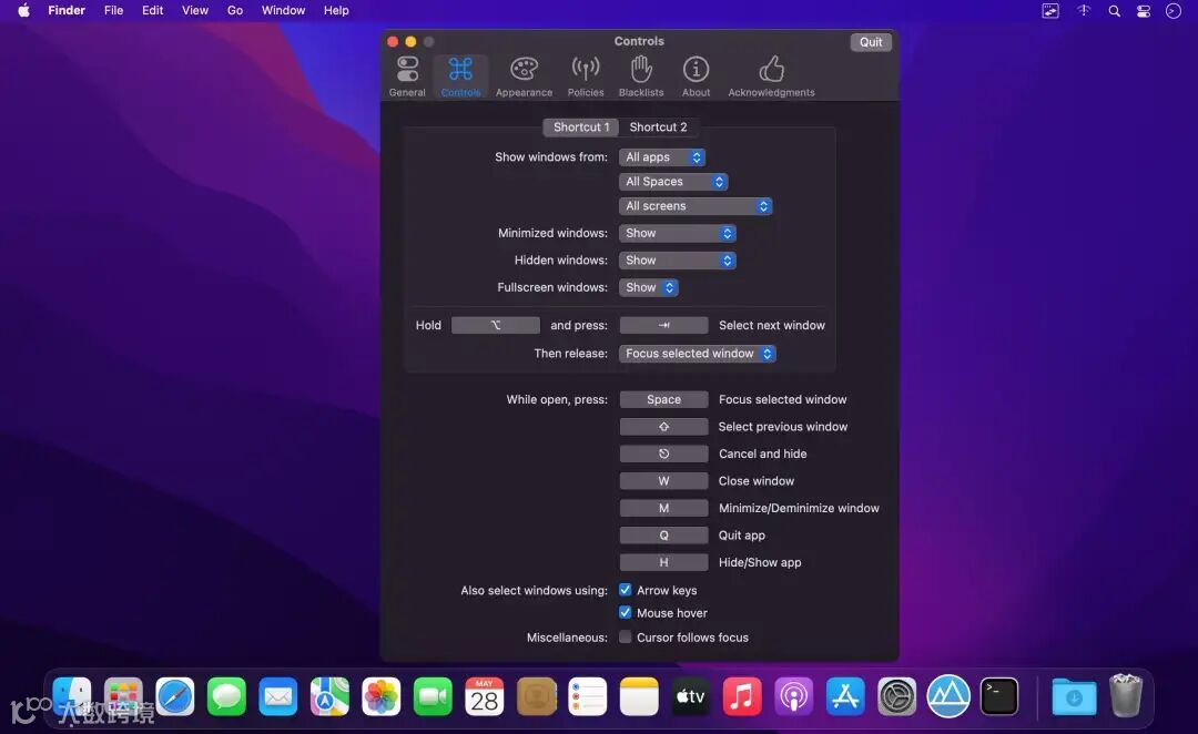 深度快捷键自定义你可以把触发快捷键改成任何你顺手的组合,不局限于默认的 Option+Tab,甚至在切换界面里就能直接用键盘最小化或关闭选中窗口,这几乎重塑了你在 Mac 上管理窗口的习惯